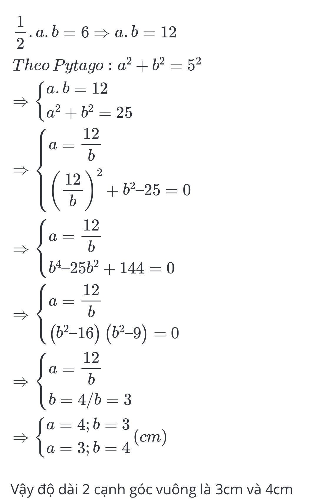 Vậy độ dài các cạnh góc vuông của tam giác lần lượt là: `3` `cm` và `4` `cm`