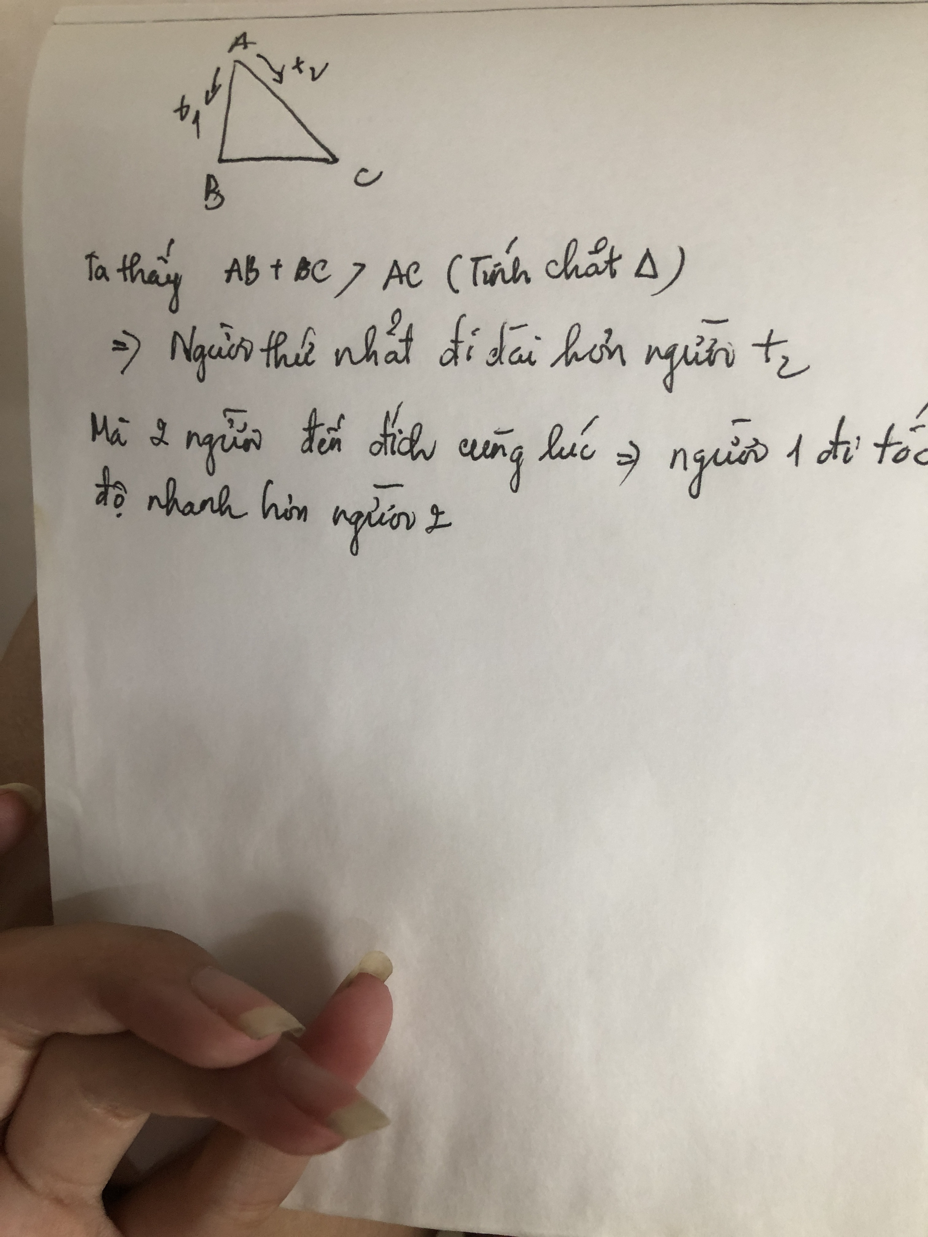 Hai người đi xe từ A đến C. Người thứ nhất đi theo đường từ A đến B rồi từ B đến C. Người thứ hai đi thẳng từ A đến C. Cả hai đều về đích cùng lúc. Tính quãng đường và độ dịch chuyển của người t1 và người t2, so sánh và nhận xét kết quả