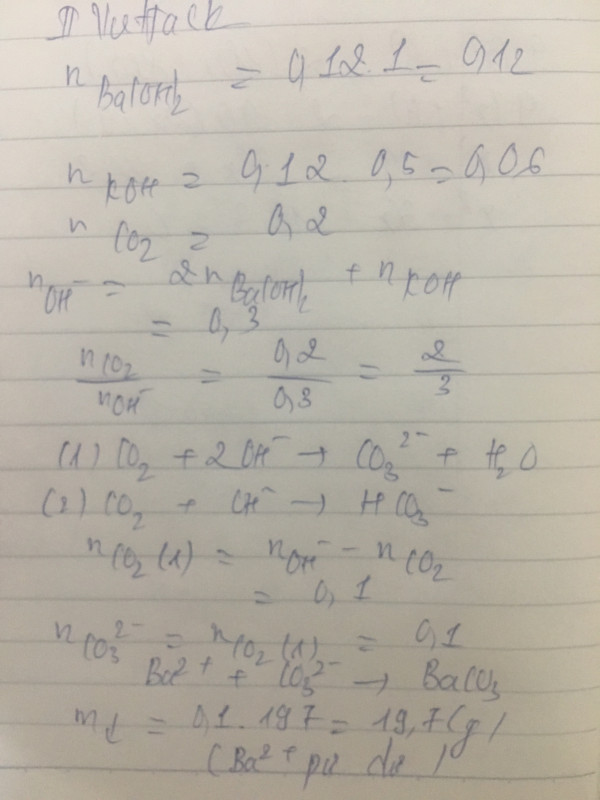Sục 8,8 gam Co2 vào 120 ml dung dịch chứa đồng thời Ba(oh)2 1M và koh 0,5 M . Khối lượng kết tủa thu được sau khi phản ứng sảy ra hoàn toàn bao nhiều gam