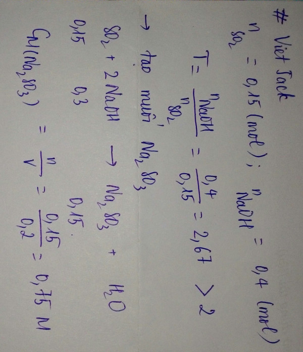 Dẫn 3.36 lít (đktc) khí SO2 vào 200ml dung dịch NaOH 2M. Muối nào được tạo thành ? Tính nồng độ mol của dung dịch muối đó.