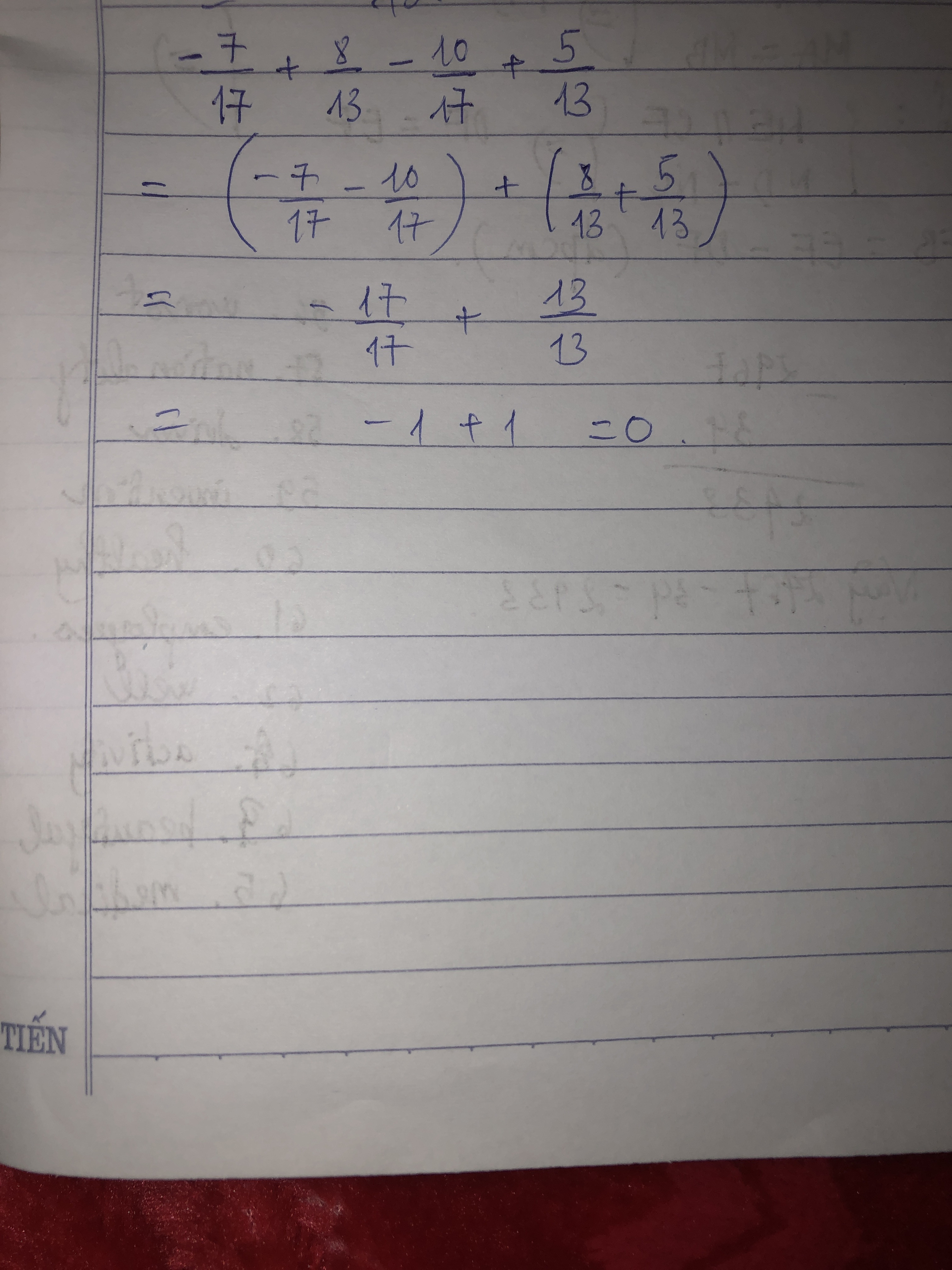 `=((-7)/17-10/17)+(8/13+5/13)`