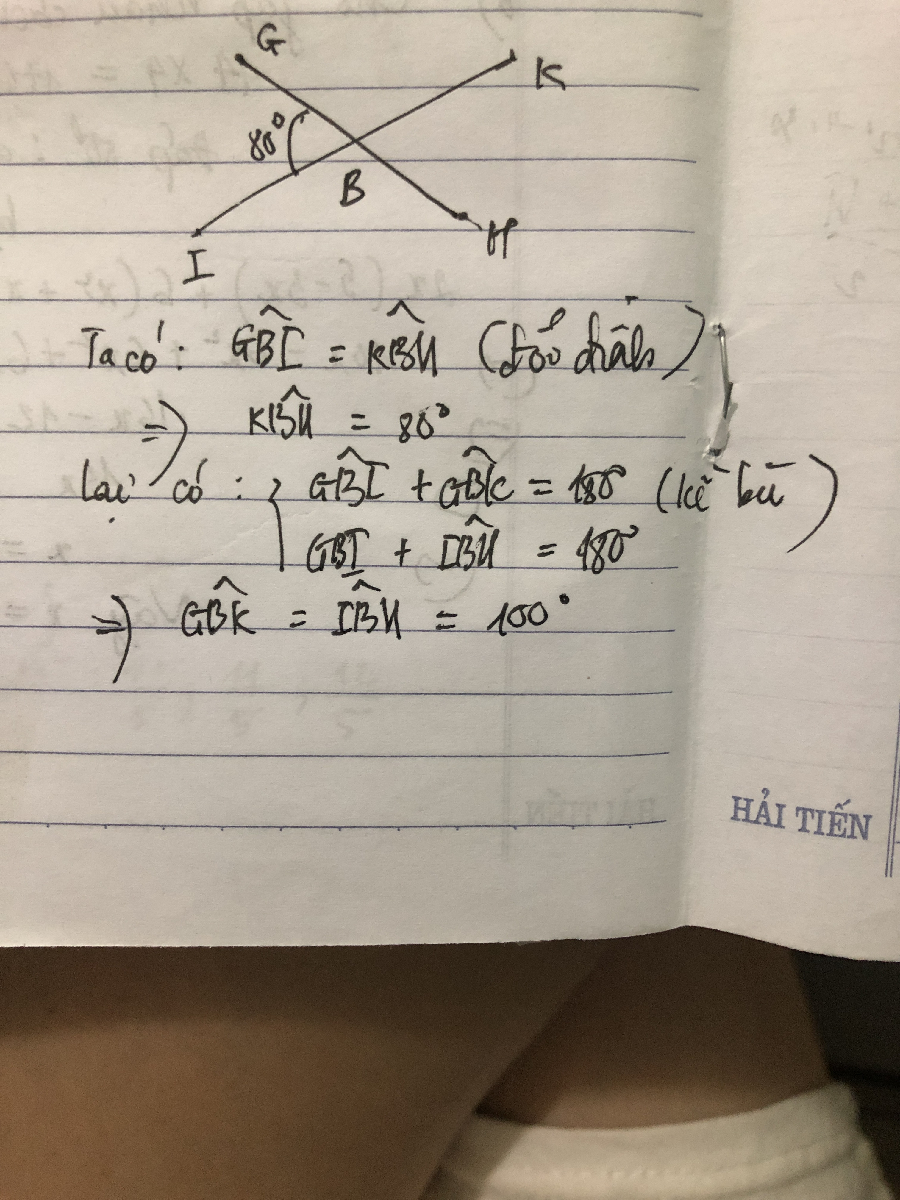 Cho hai đường thẳng GH và IK cắt nhau tại B biết góc GBI bằng 80 độ Tính ba góc còn lại