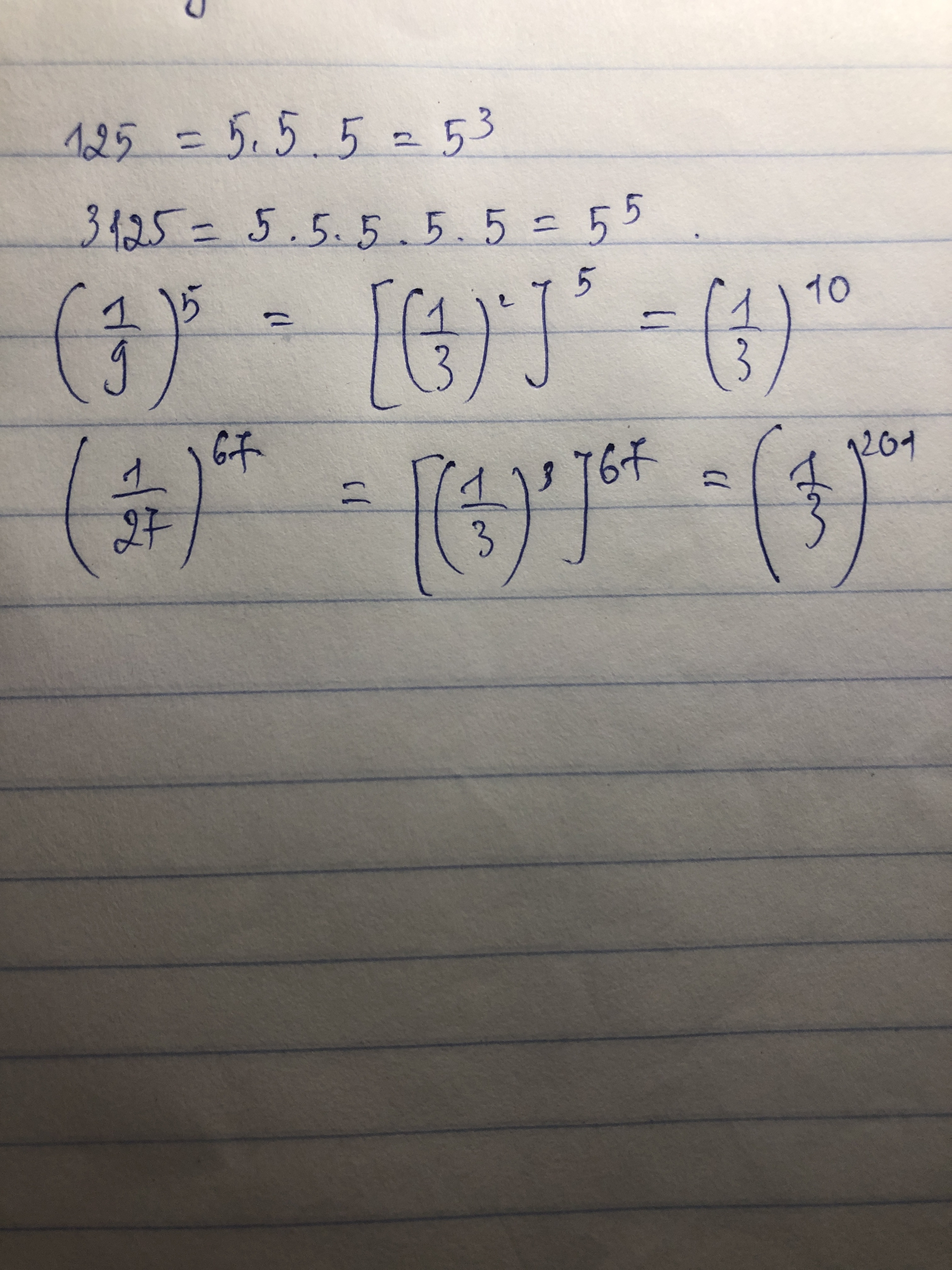 Viết các số (1/9)^5 ; (1/27)67 dưới dạng lũy thừa cơ số 1/3