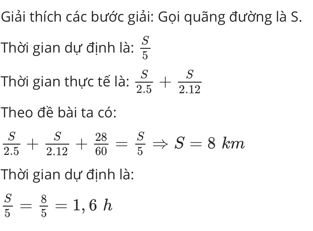 Một người dự định đi bộ một quãng đường với vận tốc không đổi là 5 km/h, nhưng khi đi được 1/3 quãng đường thì được bạn đèo bằng xe đạp đi tiếp với vận tốc 12 km/h do đó đến sớm hơn dự định là 28 phút. Hỏi nếu người đó đi bộ hết quãng đường thì mất bao lâu