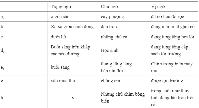 | Trạng ngữ | Chủ ngữ | Vị ngữ | |