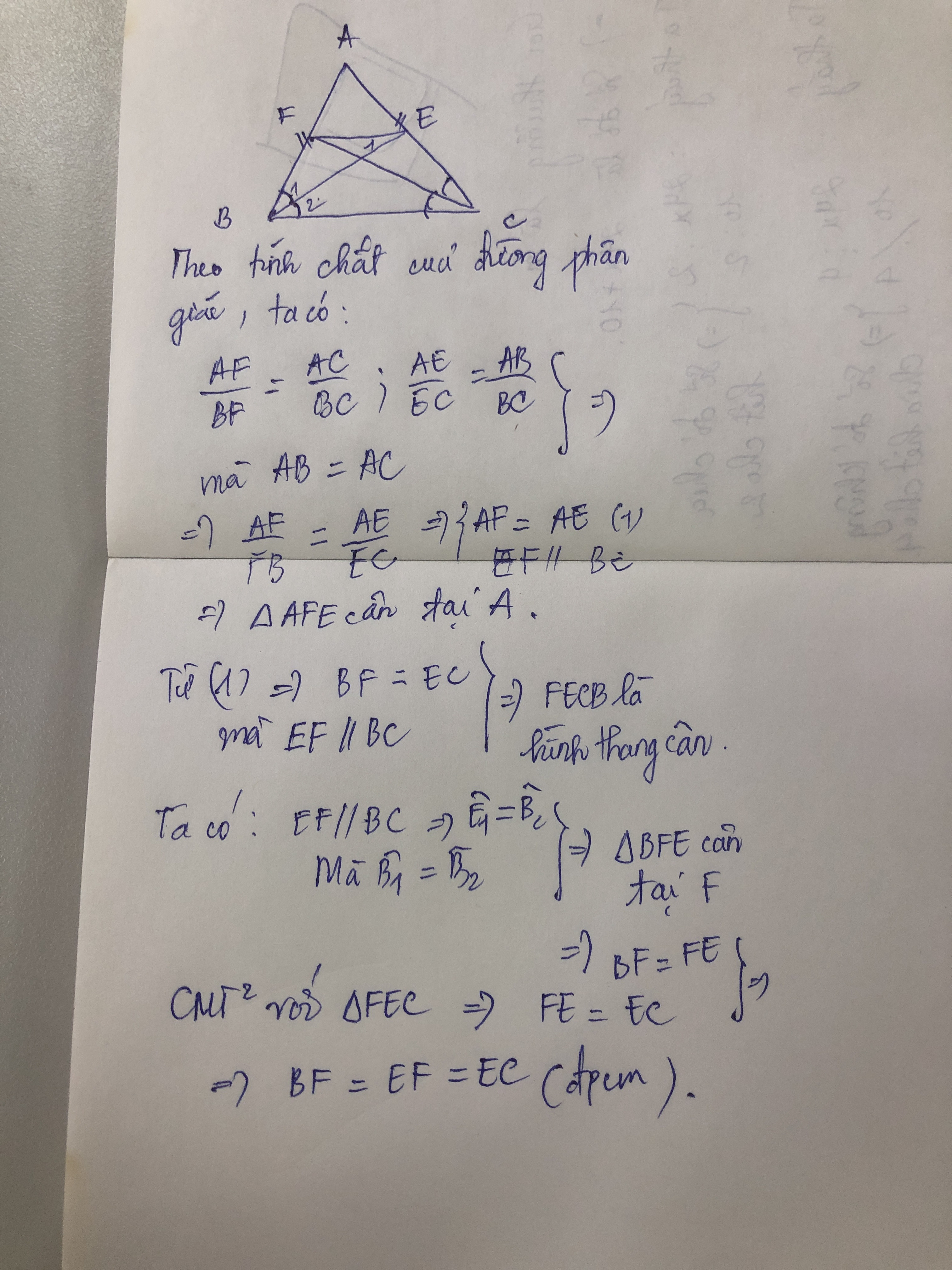 Cho tam giác ABC cân tại A, các đường phân giác BE và CF. Chứng minh: