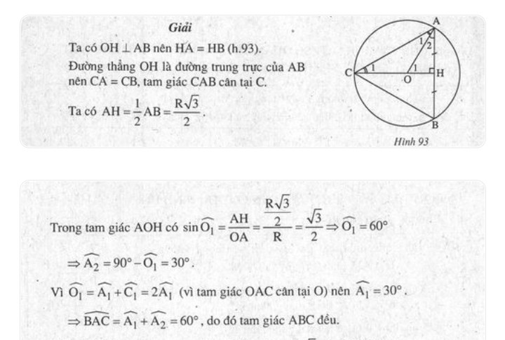 Cho đương tròn (O , R ) có dây AB dài bằng R √3 . Vẽ đường kính CD vuông góc với dây AB tại H, C thuộc cung lớn AB . Chứng minh ABC đều