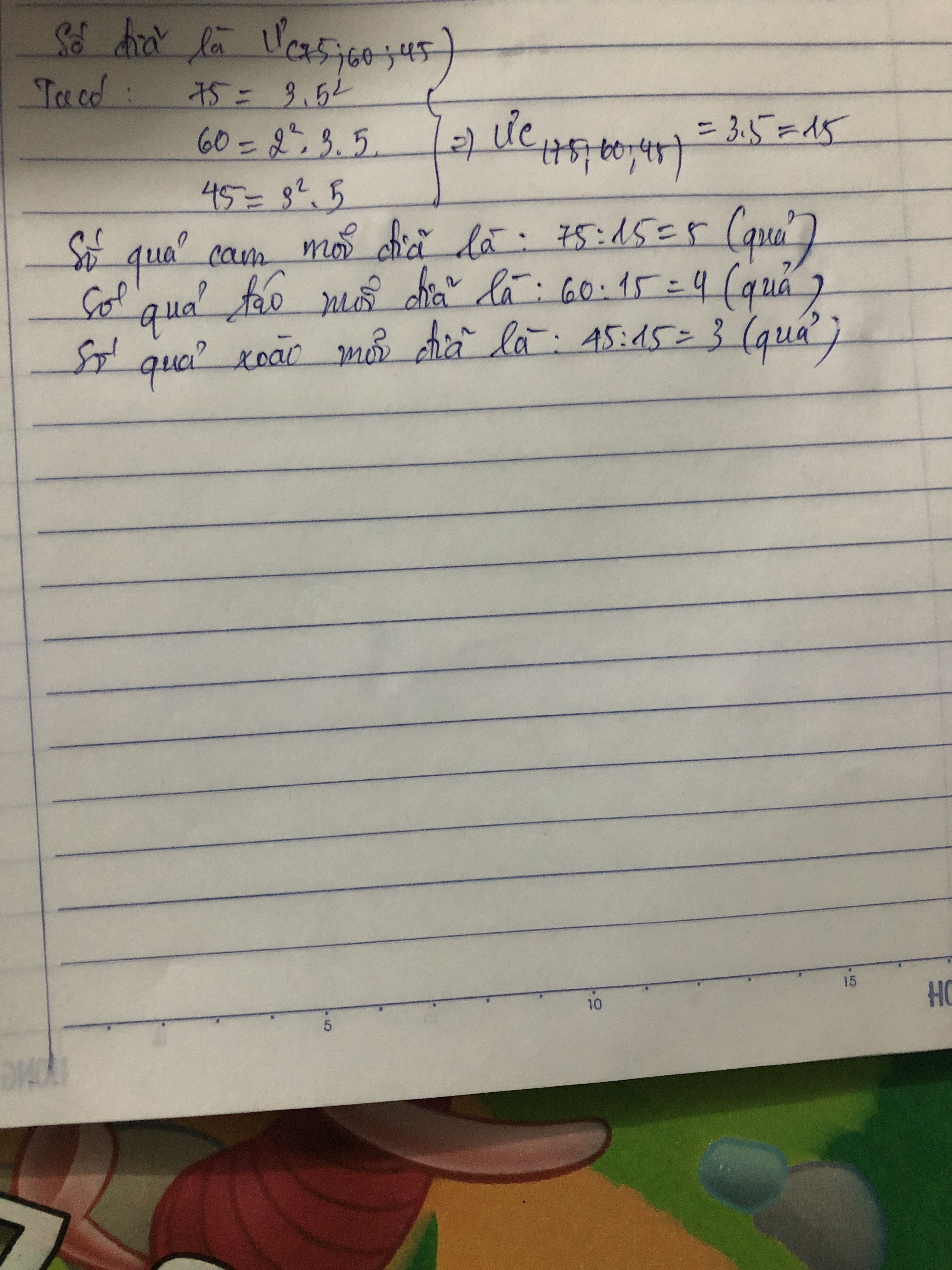 mẹ mua 75 quả cam ;60 quả táo ; 45 quả xoài mẹ muốn xếp vào các đĩa mỗi loại quả như nha . Hỏi mẹ xếp dc bao nhiêu đĩa ?tính số quả mỗi loại của mỗi đĩa