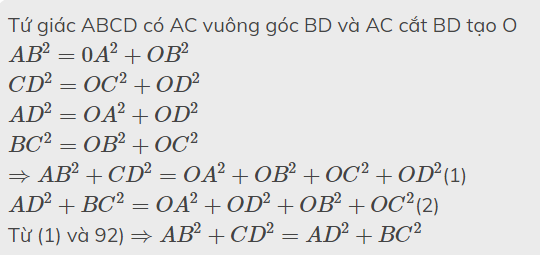 Do đó trong một tứ giác có 2 đường chéo vuông góc với nhau thì tổng bình phương của hai cạnh đối này bằng tổng bình phương của hai cạnh đối kia