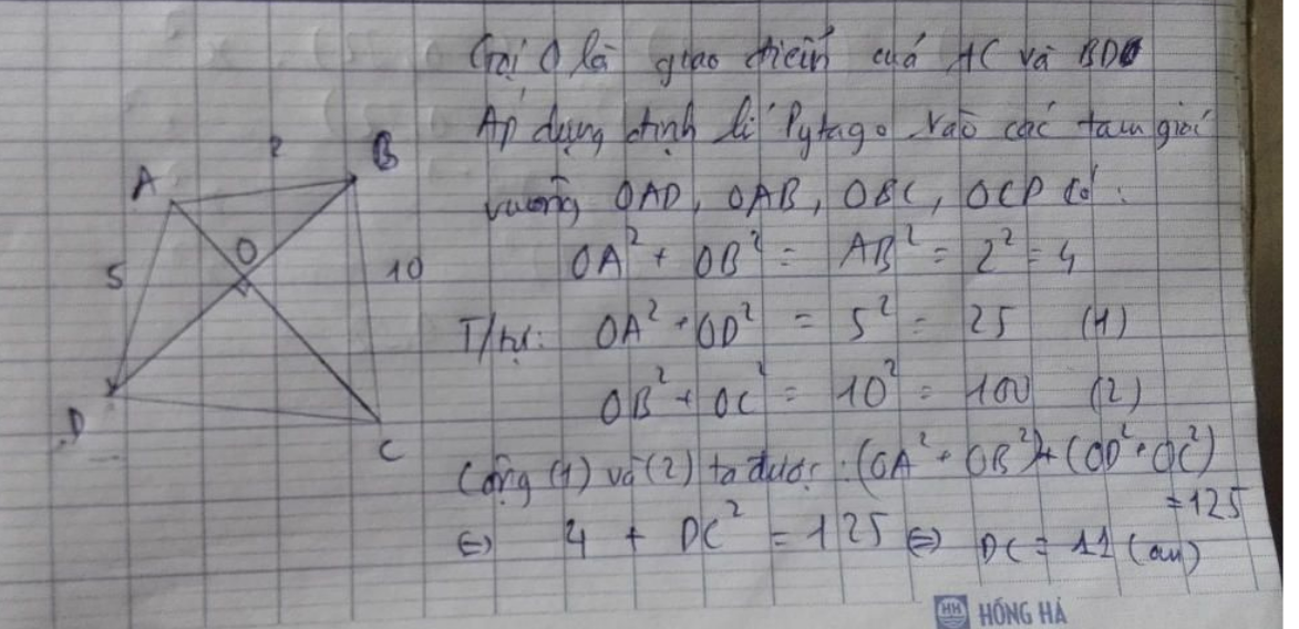 b, tứ giác ABCD có AC vuông góc BD biết AD = 5 cm AB = 2 cm BC = 10 cm.Tính CD