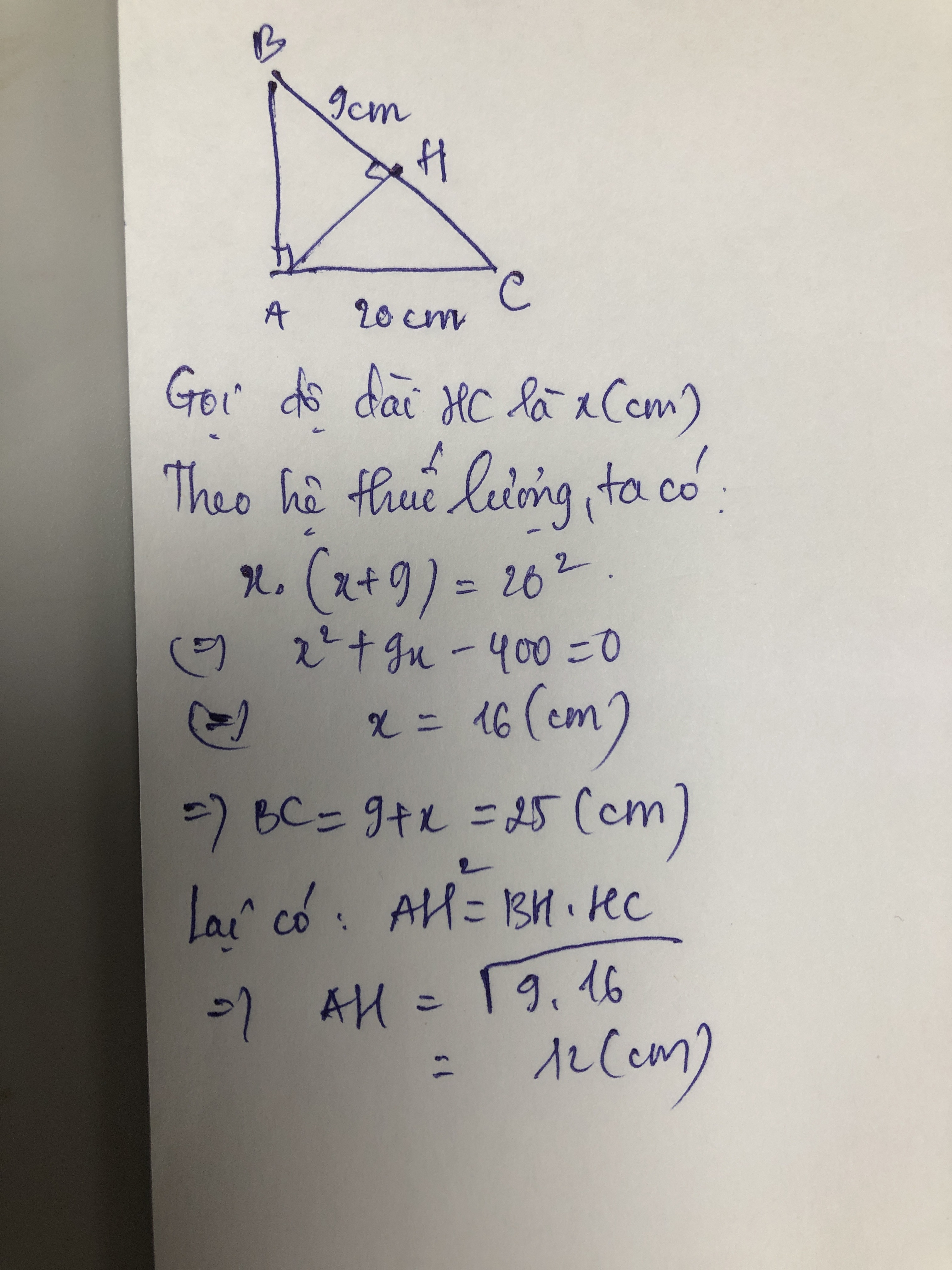 Cho tam giác ABC vuông tại A, đường cao AH. Biết AC = 20cm, BH = 9cm. Tính độ dài BC và AH