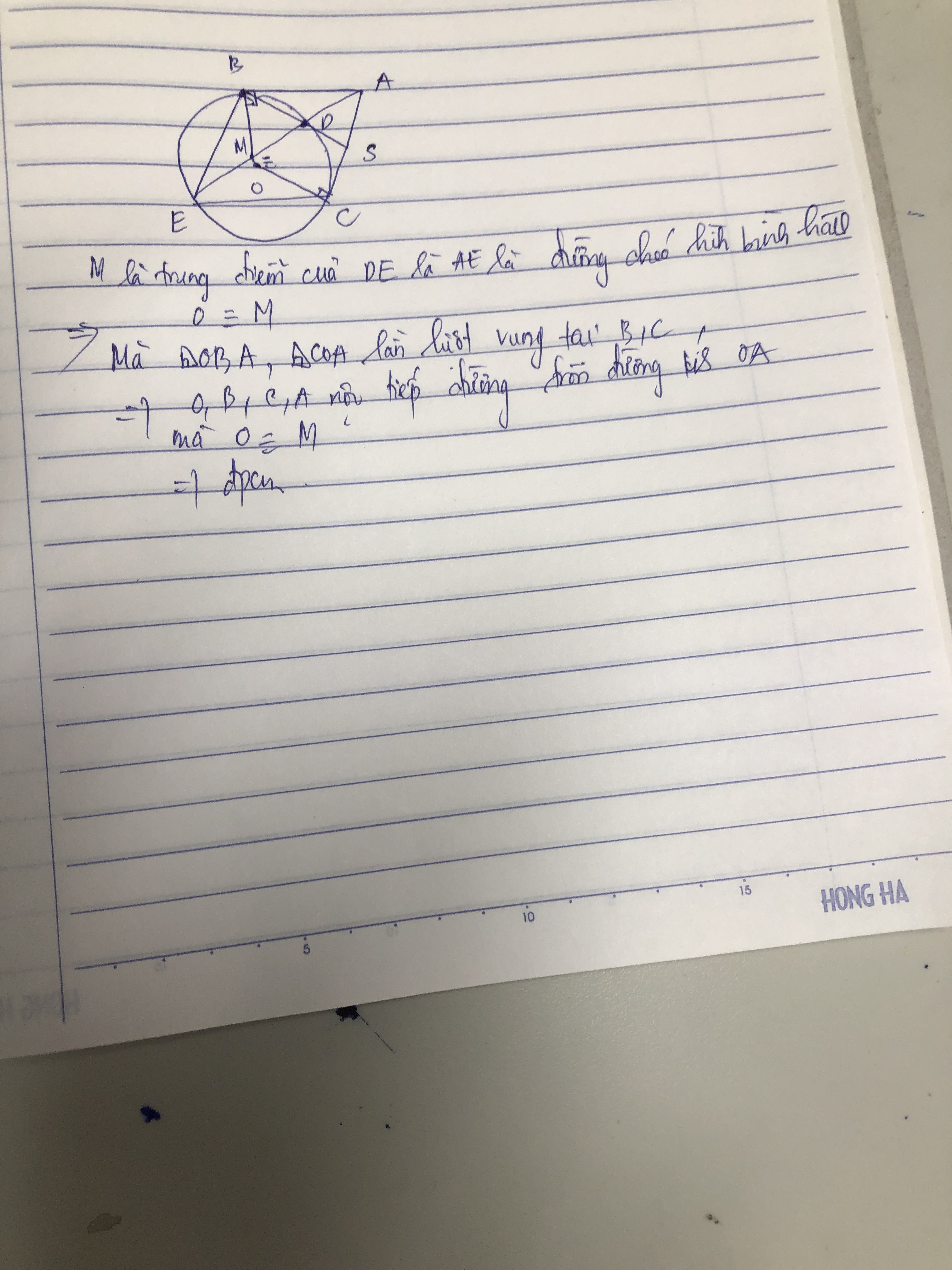 từ A nằm ngoài (O) vẽ 2 tiếp tuyến AB,AC. Vẽ dây BE của đường tròn (O) song song với AC,AE căt (O) tại D khác E;BD cắt AC tại S. Gọi M là trung điểm của đoạn DE.