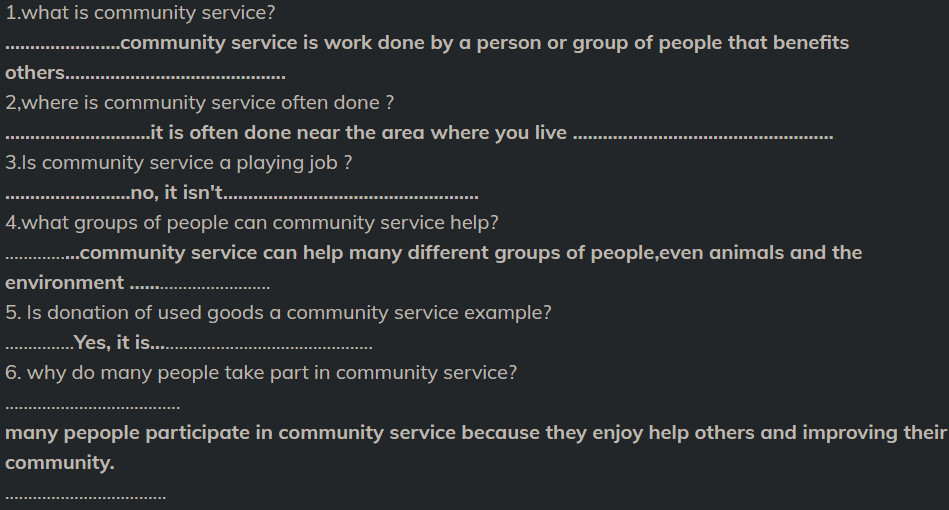 1.1.Community sirvice is work done by a person or group of people that benefits others.