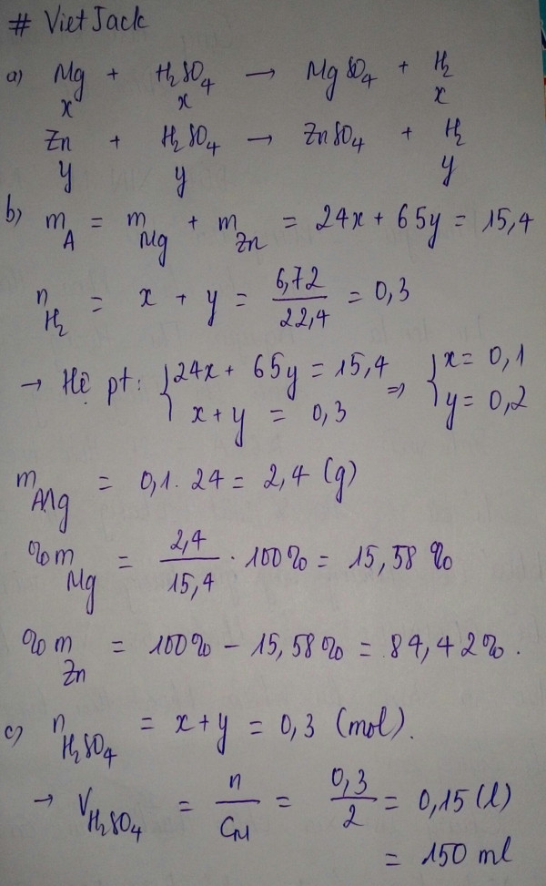 Hòa tan hoàn toàn 15,4gam hh A gồm Mg và Zn trong dung dịch axit sunfuric loãng 2M thấy sinh ra 6,72 lít khí (đktc)