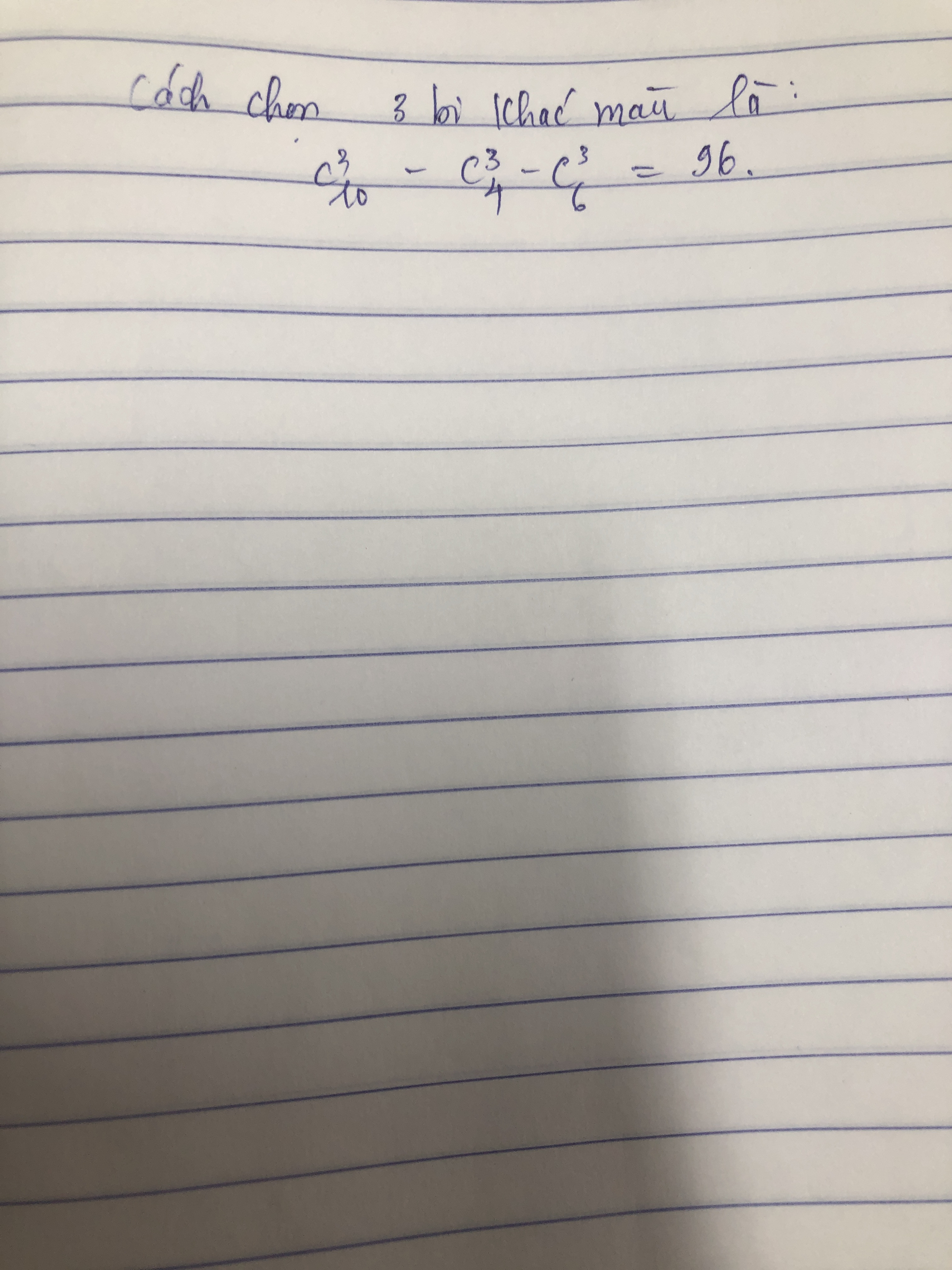 1 hộp có 6 bi đỏ, 4 bi trắng. Có bao nhiêu cách chọn 3 bi khác màu