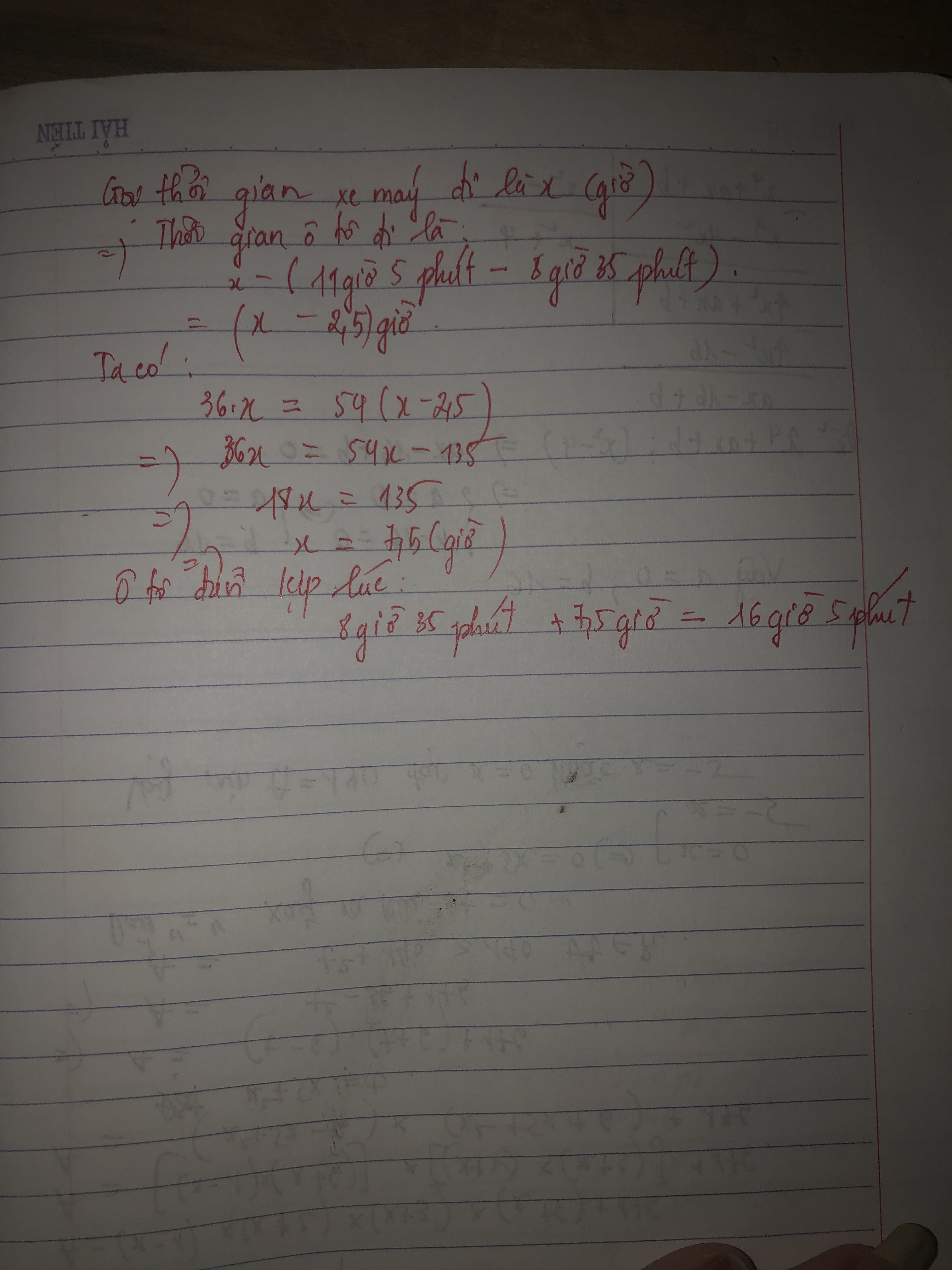 Một xe máy đi từ A đến B lúc 8 giờ 35 phút với vận tốc 36 km/h. Đến 11 giờ 5 phút, một ô tô cũng đi từ A đuổi theo xe máy với vận tốc 54 km/h. Hỏi ô tô đuổi kịp xe máy lúc mấy giờ? Lập bảng🆘