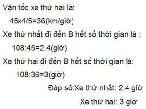 hai xe ô tô cùng xuất phát từ A đến B.xe một đi vs vận tốc 45km/h. Xe hai đi với vận tốc bằng 4/5 vận tốc xe một. Tính thời gian mỗi xe đi từ A đến B, biết quãng đường AB dài 108 km