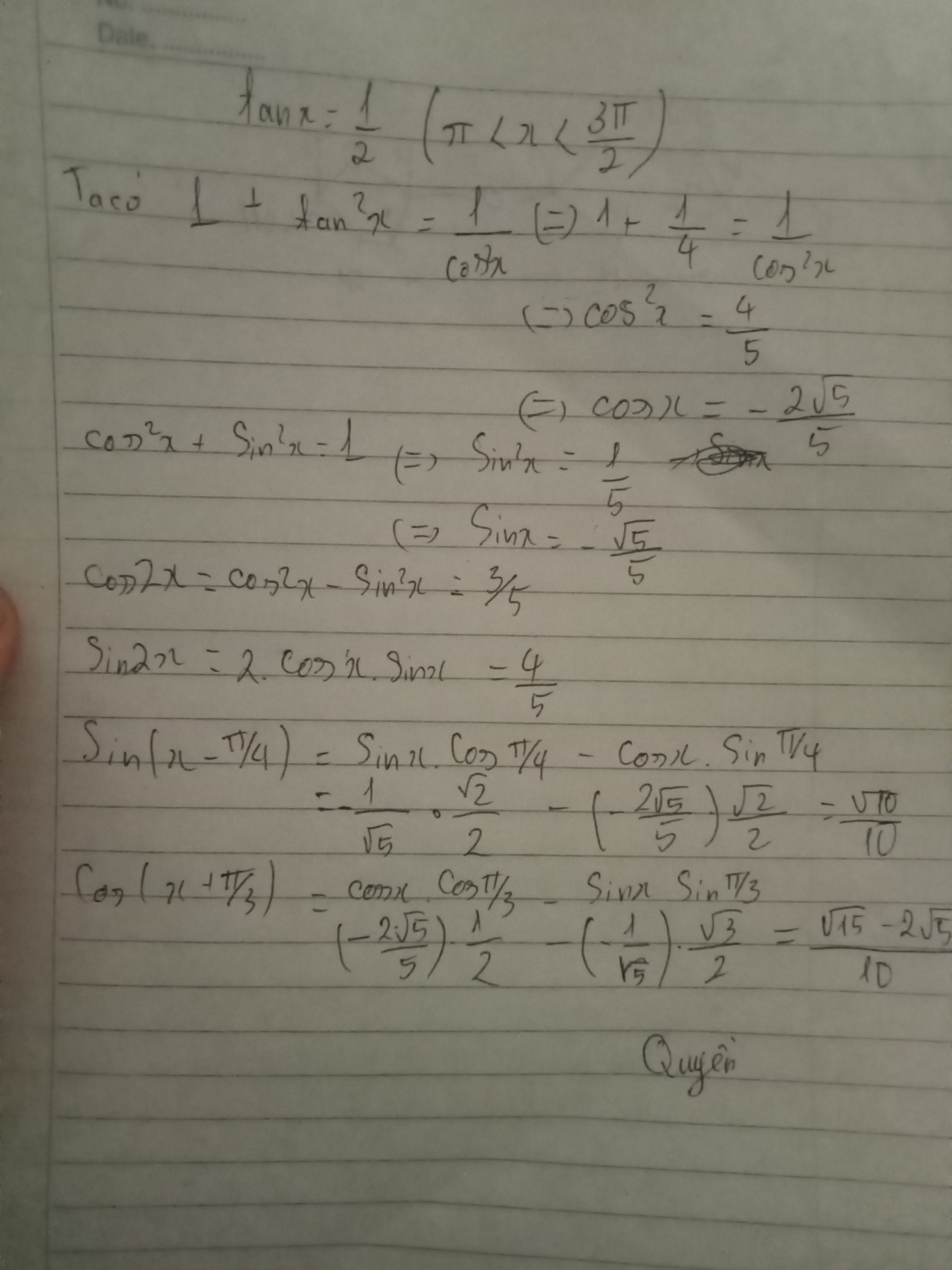 Cho tanx=1/2,π<x<3π/2. Tính cos2x, sin2x, sin(x-π/4), cos(x+π/3)