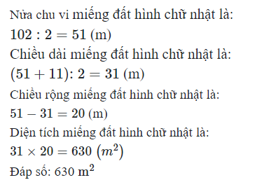 Một miếng đất hình chữ nhật có chu vi là 102m, chiều dài hơn chiều rộng 11m. Tính diện tích mảnh đất của hình chữ nhật.