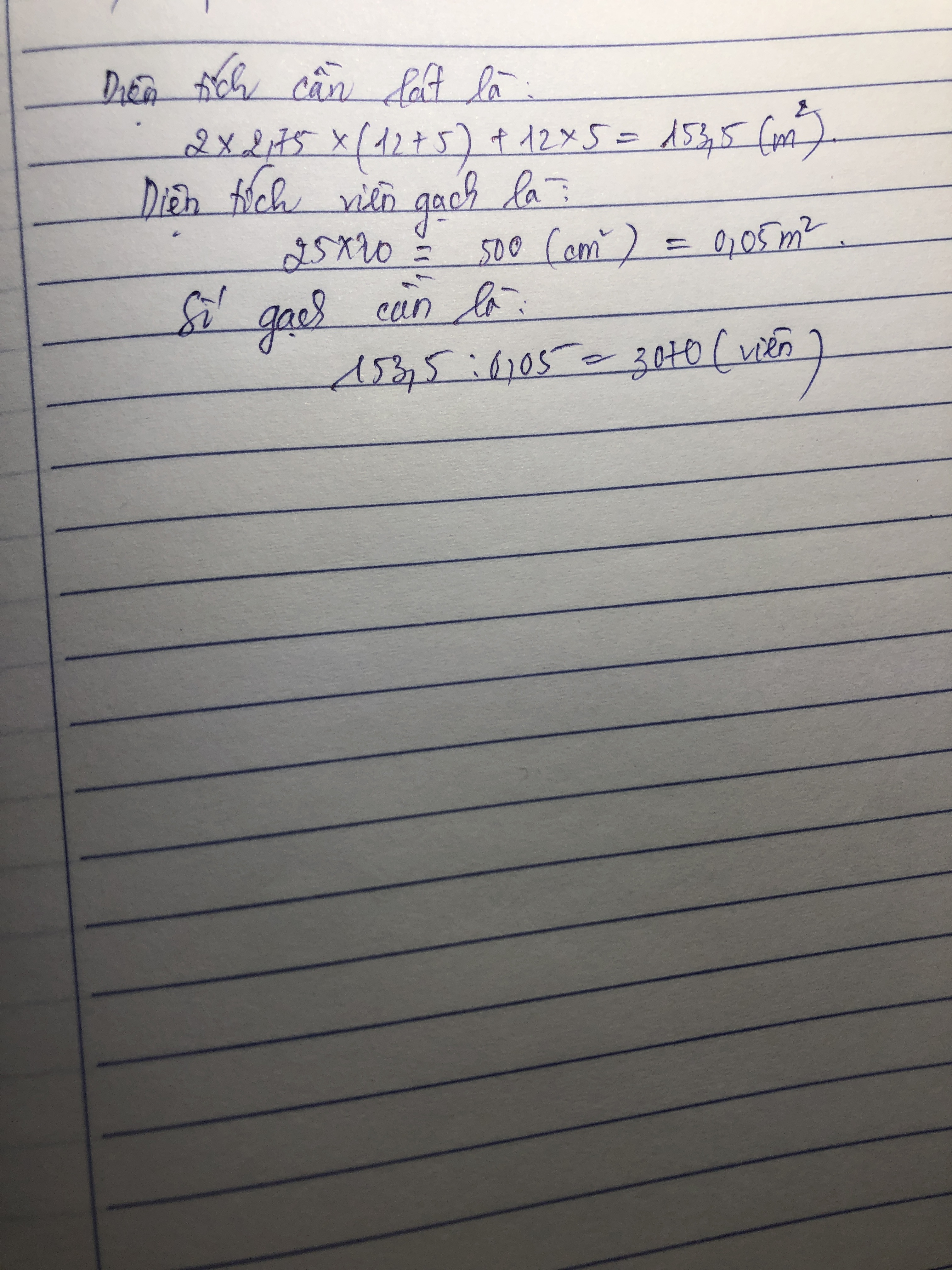 diện tích của mỗi viên gạch là: 25x20=500() = 0,05
