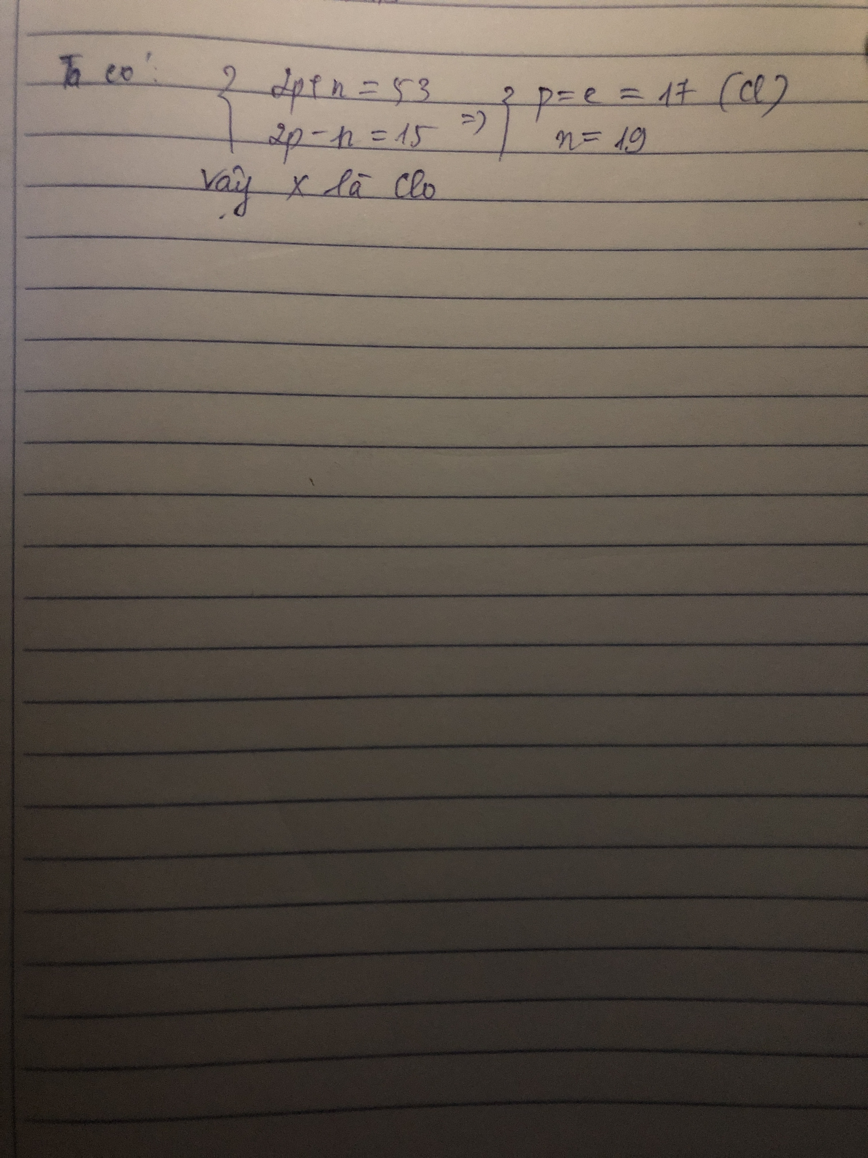 tổng số hạt trong nguyên tử X bằng 53. Số hạt mang điện nhiều hơn số hạt không mang điện bằng 15. Tính số p,n,e và xác định nguyên tố X