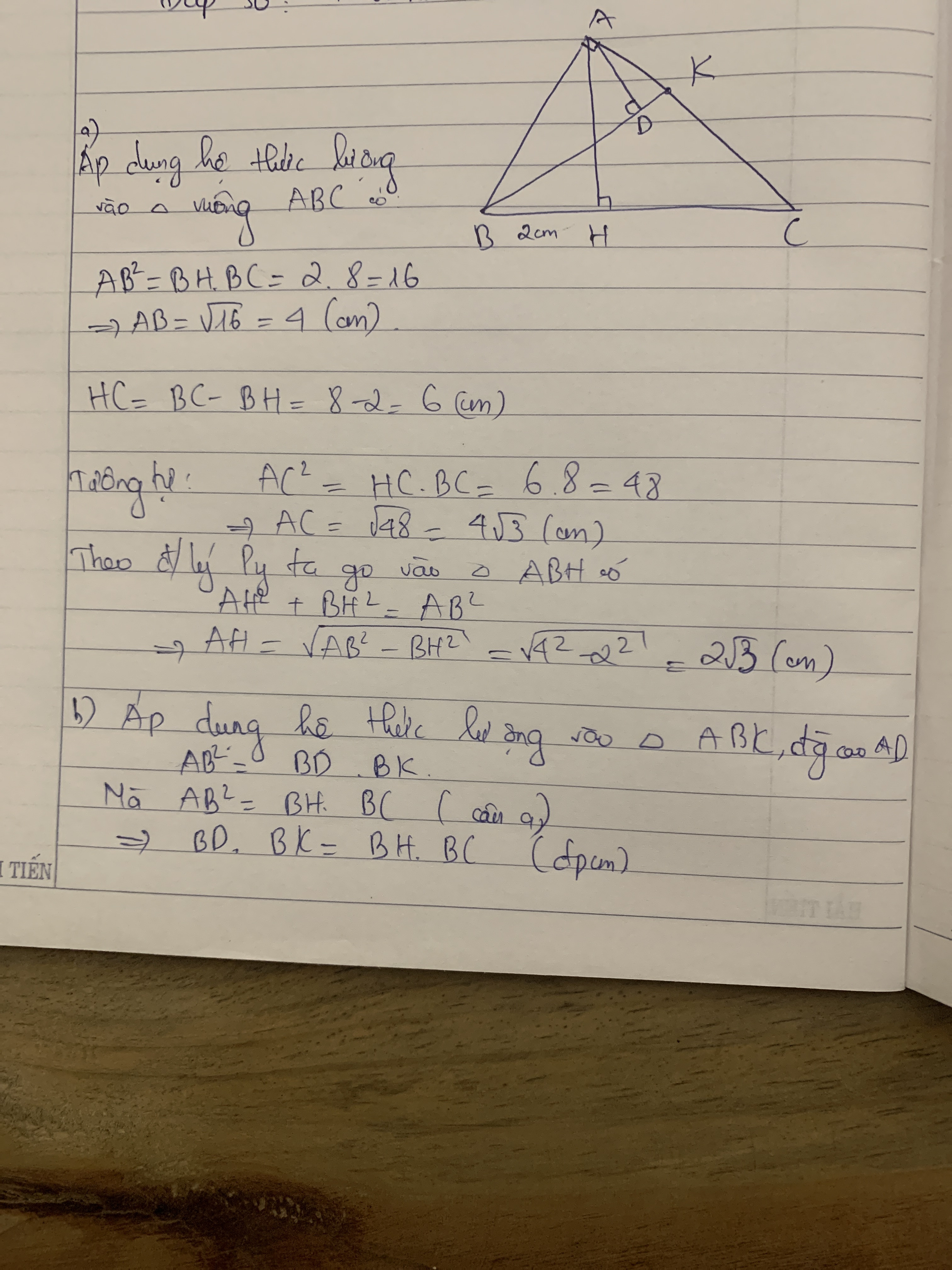 cho tam giác ABC vuông tại A có đường cao Ah biết BC=8 cm, BH=2 cm