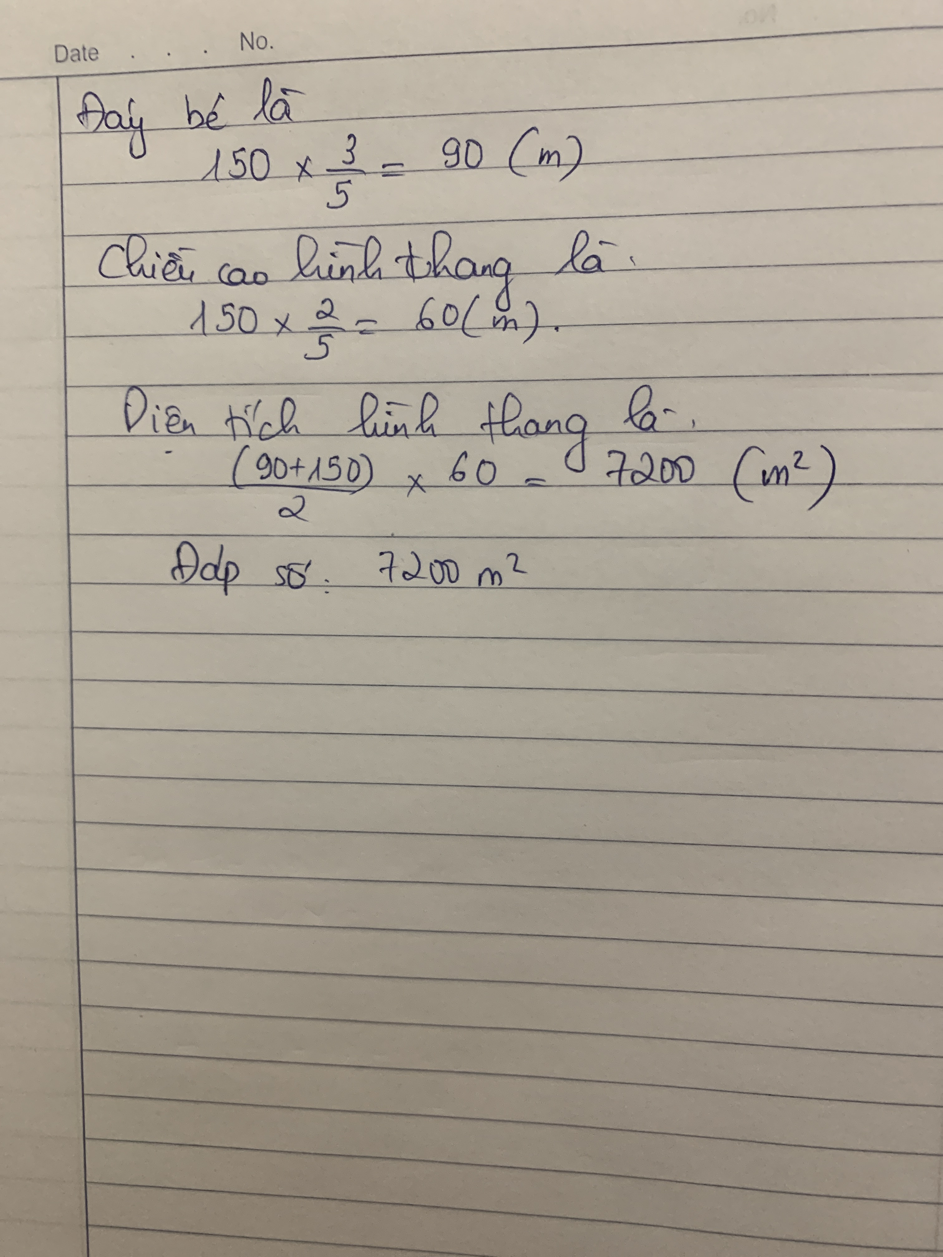 Một đám đất hình thang có đáy lớn 150m và đáy bé bằng 3/5 đáy lớn chiều cao bằng 2/5 đáy lớn tính diện tích đám đất hình thang đó