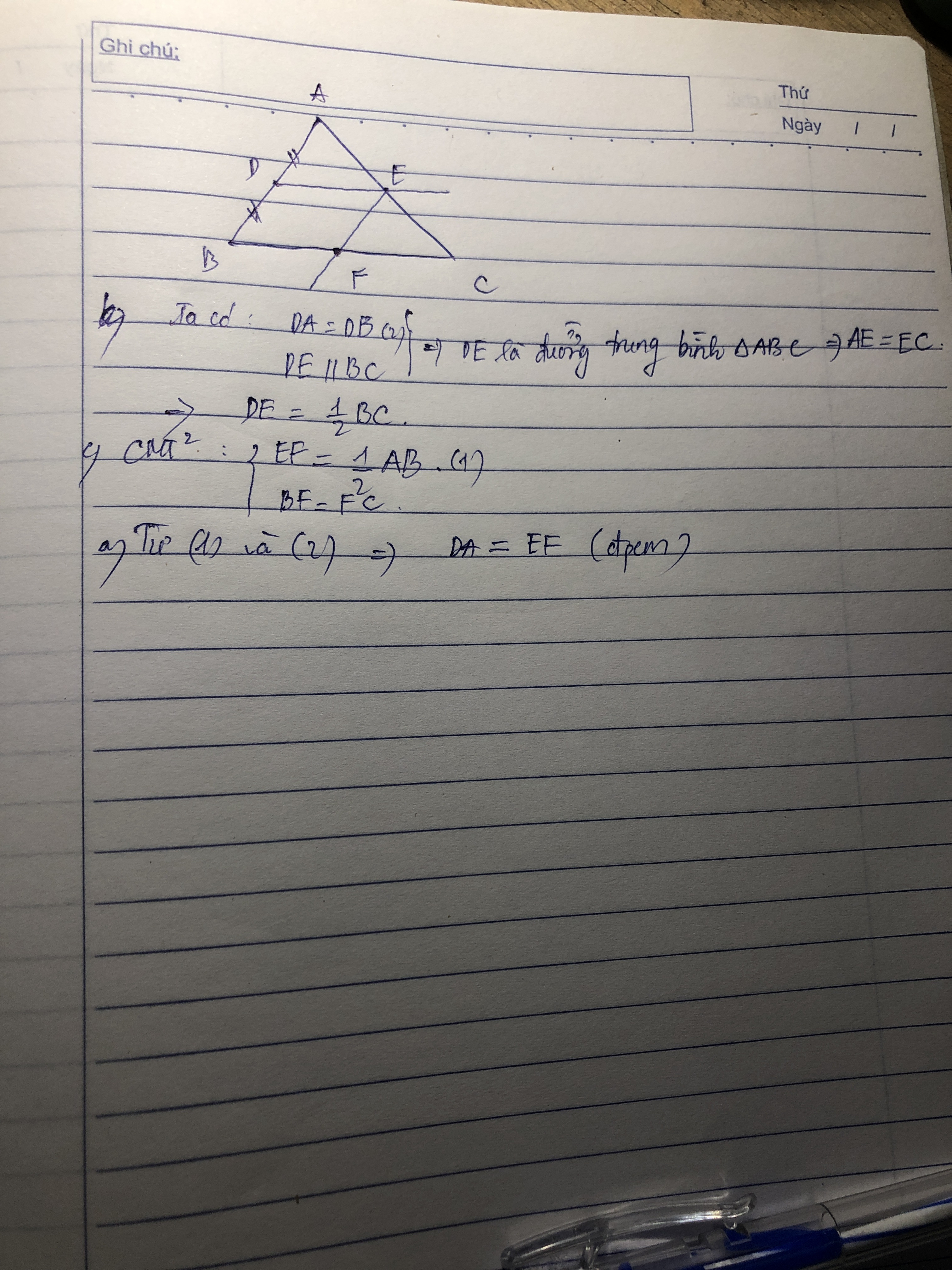 cho tam giác abc, d là trung điểm của ab. đường thẳng kê qua d // bc cắt ac tại e, đường thẳng kẻ qua e // ab cắt bc tại f. cmr