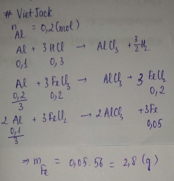 Cho 5,4 gam Al vào dung dịch chứa 0,2 mol FeCl3 và 0,3 mol HCl. Sau khi các phản ứng hoàn toàn, thu được m gam chất rắn. Giá trị của m là