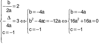 Biết rằng hàm số y = ax2 + bx + c (a ≠ 0) đạt cực đại bằng 3 tại x = 2 và có đồ thị hàm số đi qua điểm A(0; – 1). Tính tổng S = a + b + c.