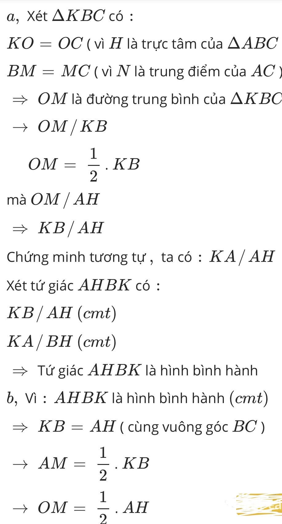 b, Xét tam giác BKC có MO là đường trung bình » MO= 1/2BK ( tính chất đường trung bình trong tam giác) (*)