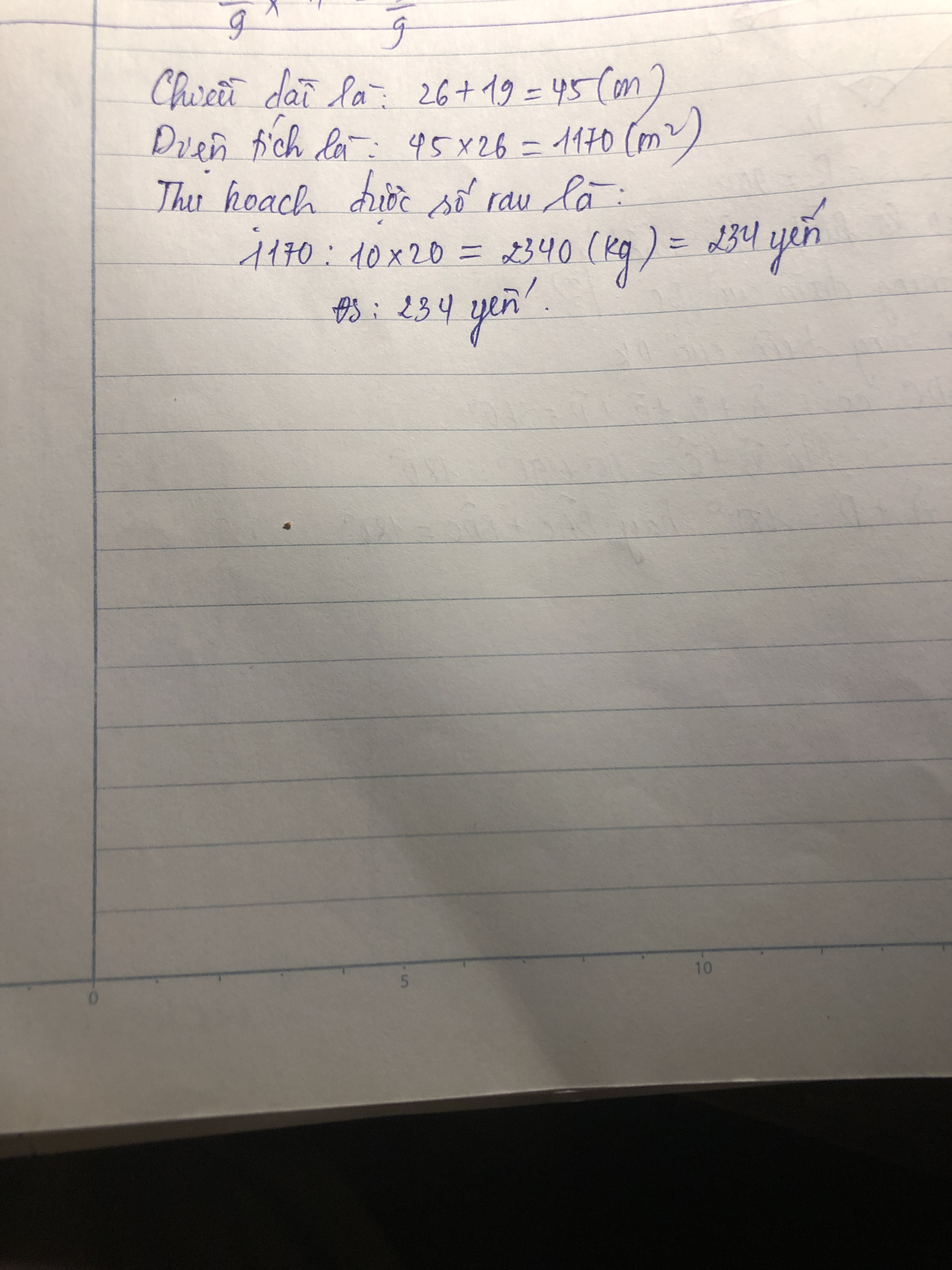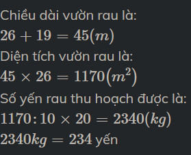 Một vườn rau hình chữ nhật có chiều rộng 26m và kém chiều dài 19m. Biết rằng cứ 10m² thì thu hoạch được 20kg ra. Hỏi cả vườn rau thu hoạch được bảo nhiêu yến rau?