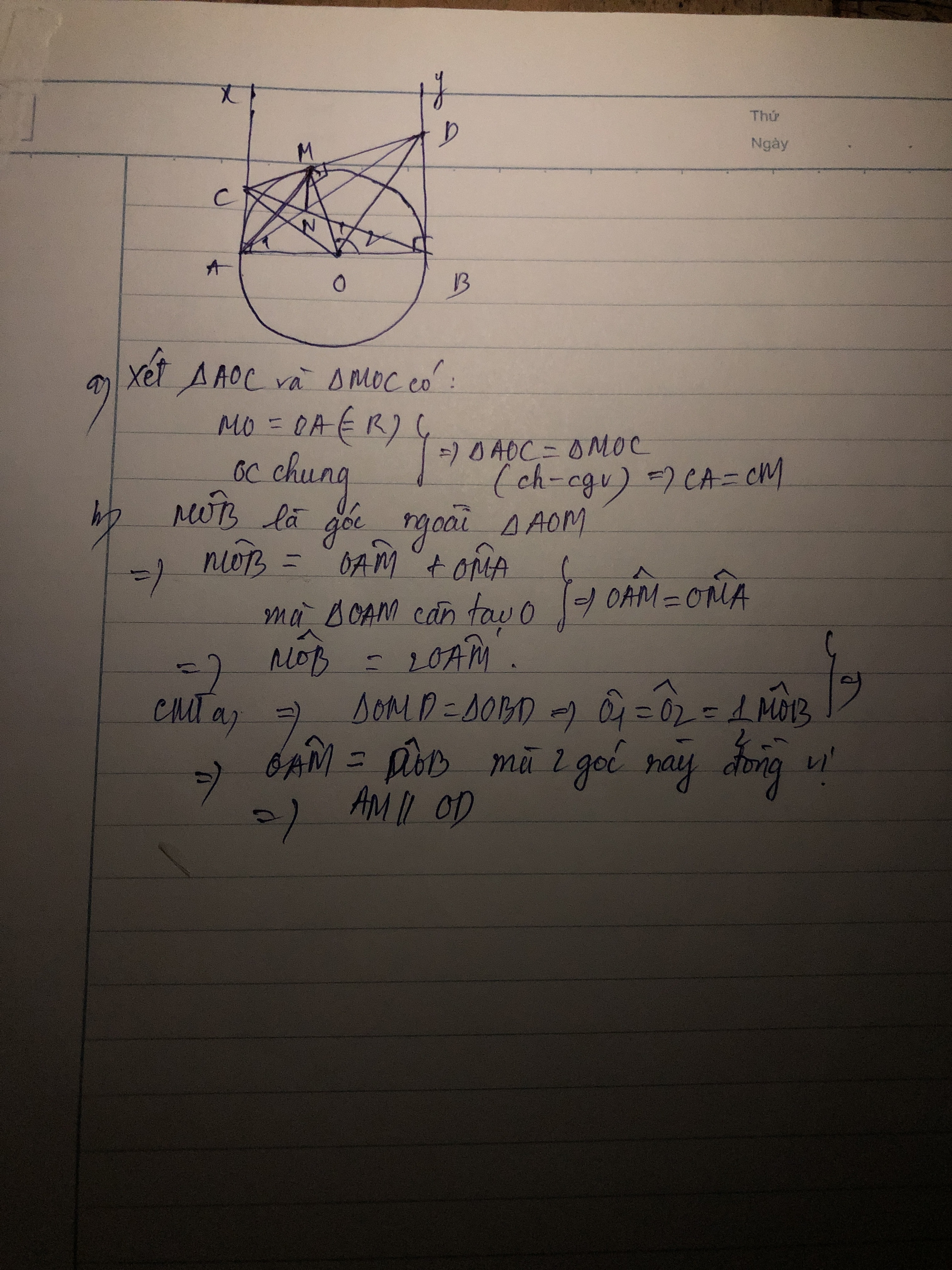 Cho nửa dường tròn tâm O có đường kính AB. Gọi Ax, By là các tia vuông góc với AB (Ax, By và nửa đường tròn thuộc cùng một nửa mặt phẳng bờ AB). Gọi M là điểm bất kì thuộc nửa đường tròn (M khác A và B). Đường thăng qua M vuông góc với OM cắt Ax tại C và cắt By tại D. a) Chứng minh CA=CM. b) Chứng minh MOB = 2. MAO, từ đó suy ra AM song song với OD. c) Gọi N là giao điểm của AD và BC. Chứng minh đường thẳng MN vuông góc với đường thẳng AB.