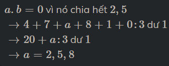 a) để chia hết cho cả 2 và 5 thì b phải là số 0, chia cho 3 dư 1 thì 4+7+a+8+1+0 phải bằng 1 số chia cho 3 dư 1=>a=2