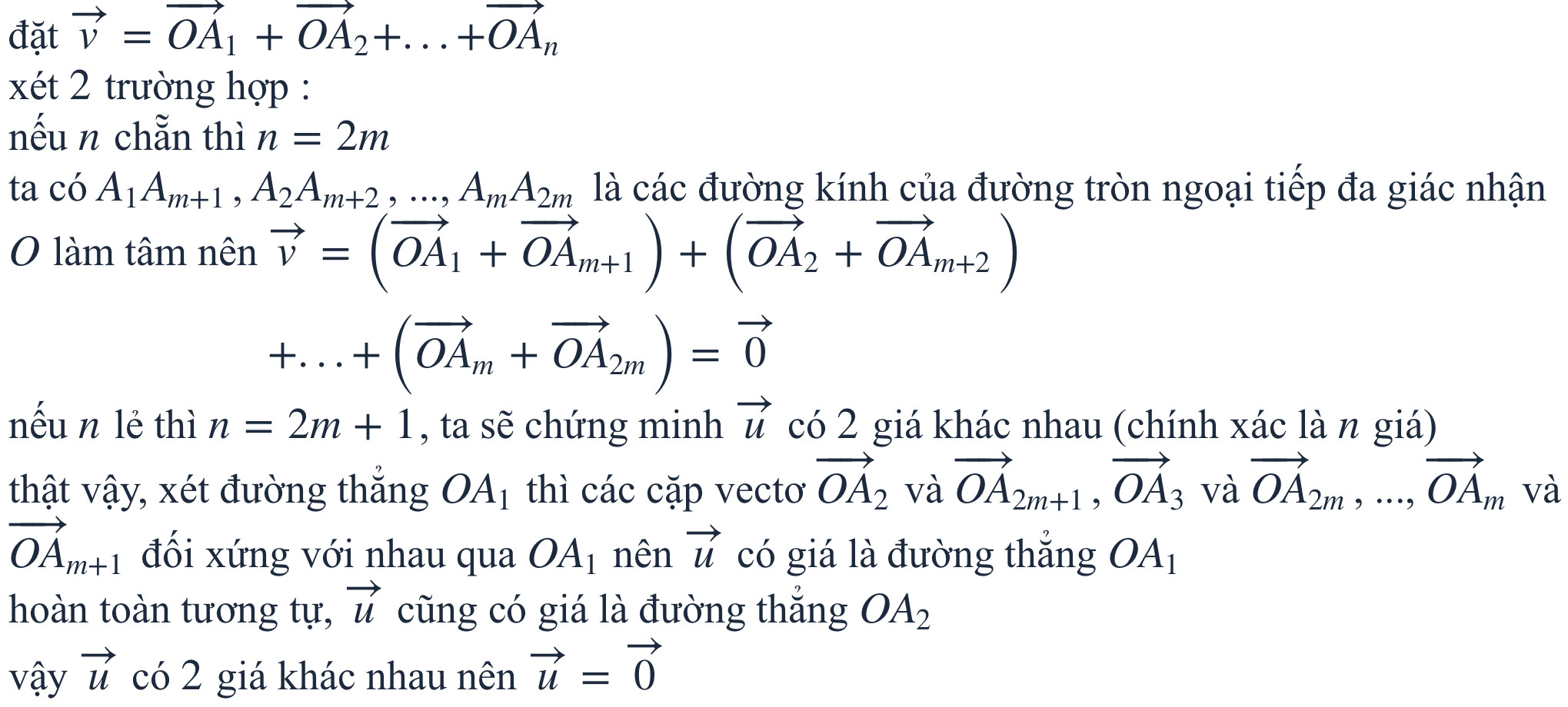 Bài 41. Cho đa giác đều A1A2...An với n ∈ N và n ≥ 3 có tâm O. Chứng minh rằng vecto u = vecto OA1 + vecto OA2 +...+vecto OAn = vecto 0 .