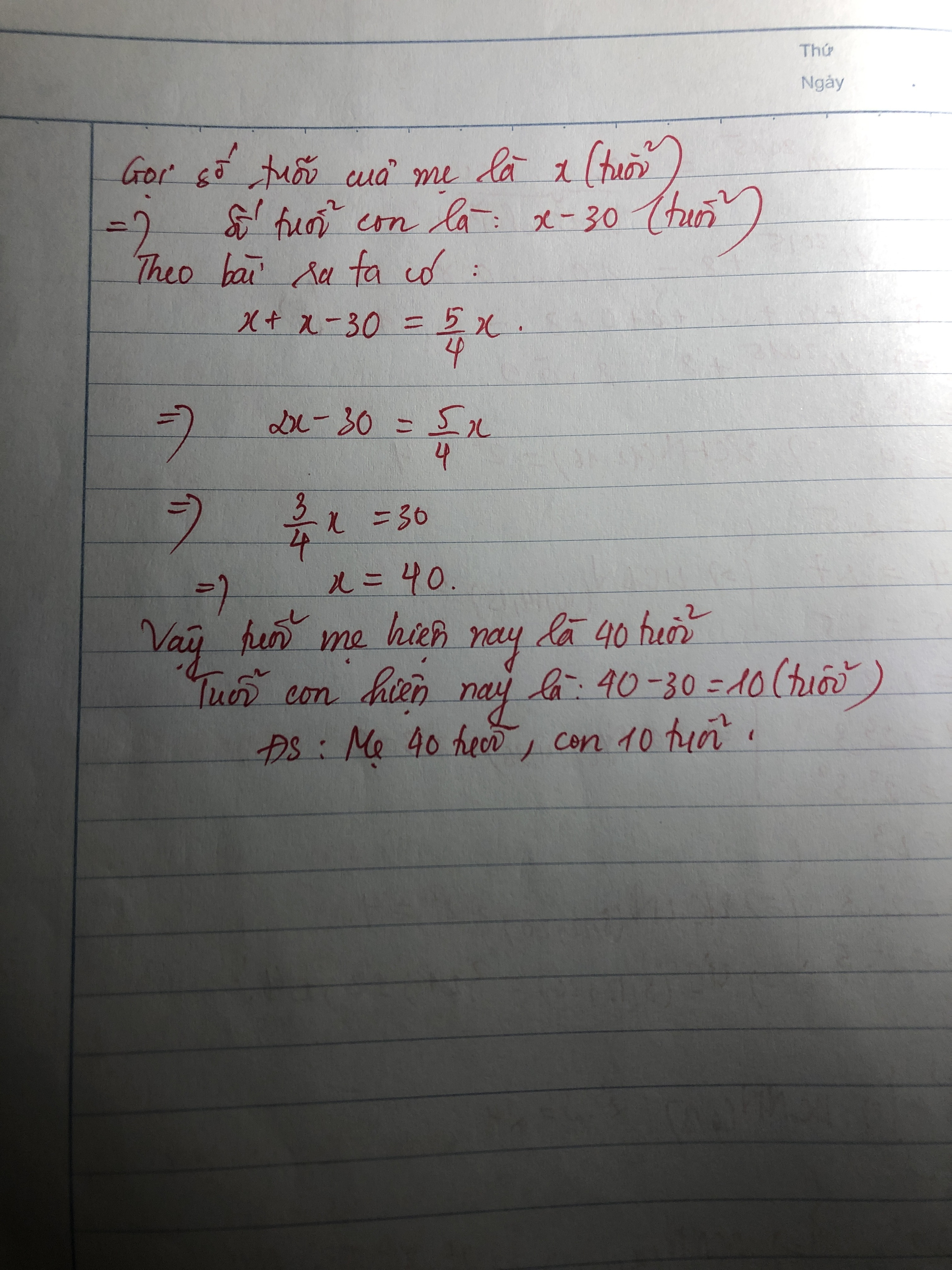 Đáp số: mẹ 40 tuổi, con 10 tuỏi