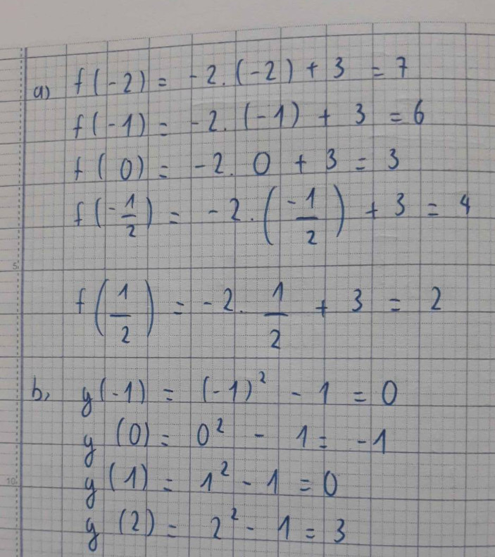 a) Cho hàm số y=f(x)=-2+3. Tính f(-2); f(-1); f(0); f(-1/2); f(1/2)