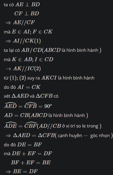Cho hình bình hành ABCD.Kẻ AE,CF vuông góc BD.AE cắt CD ở I,CF cắt AB ở K.Chứng minh rằng