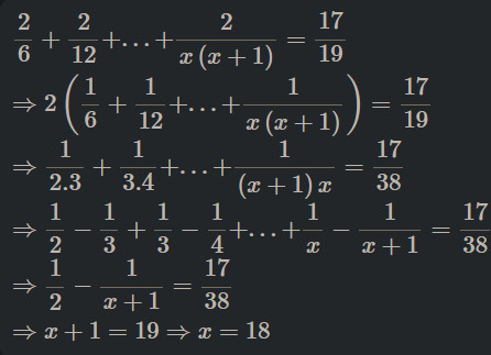 `1/2-1/3 + 1/3-1/4 + 1/4-1/5 +.......+ 1/x-1/( x + 1) = 17/19:2`