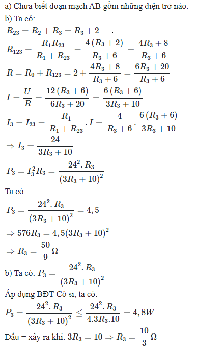 Dấu = xảy ra khi: \(3{R_3} = 10 \Rightarrow {R_3} = \dfrac{{10}}{3}\Omega \)