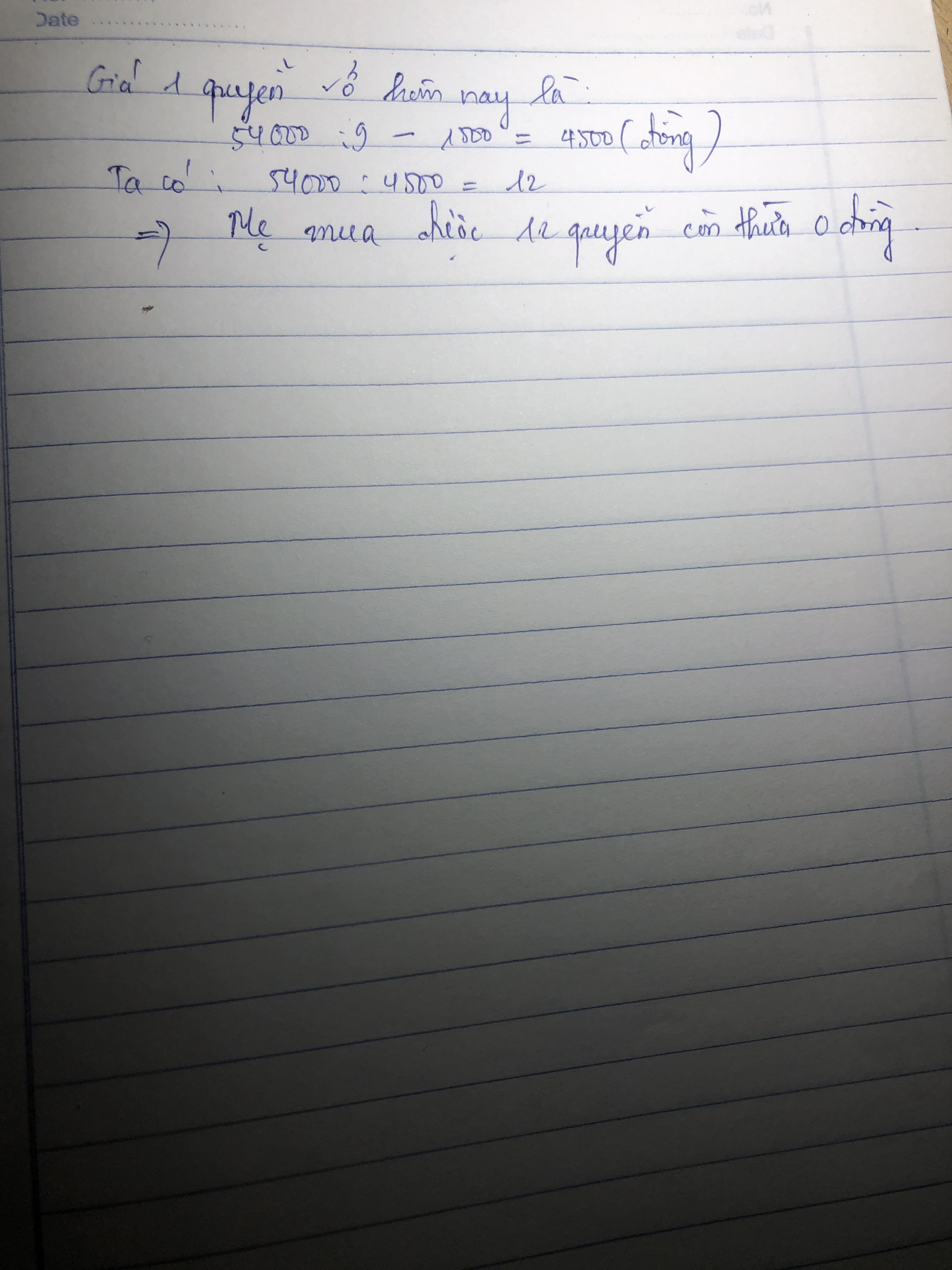 Mẹ mua 9 cuốn vở hết 54 000 đồng thì vừa hết số tiền đang có nay mỗi quýnh vở giảm đi 1500đ mỗi cuốn . Hỏi cũng số tiền đó mẹ mua được bao nhiêu cuốn vở, và còn thừa bai nhiu tiền
