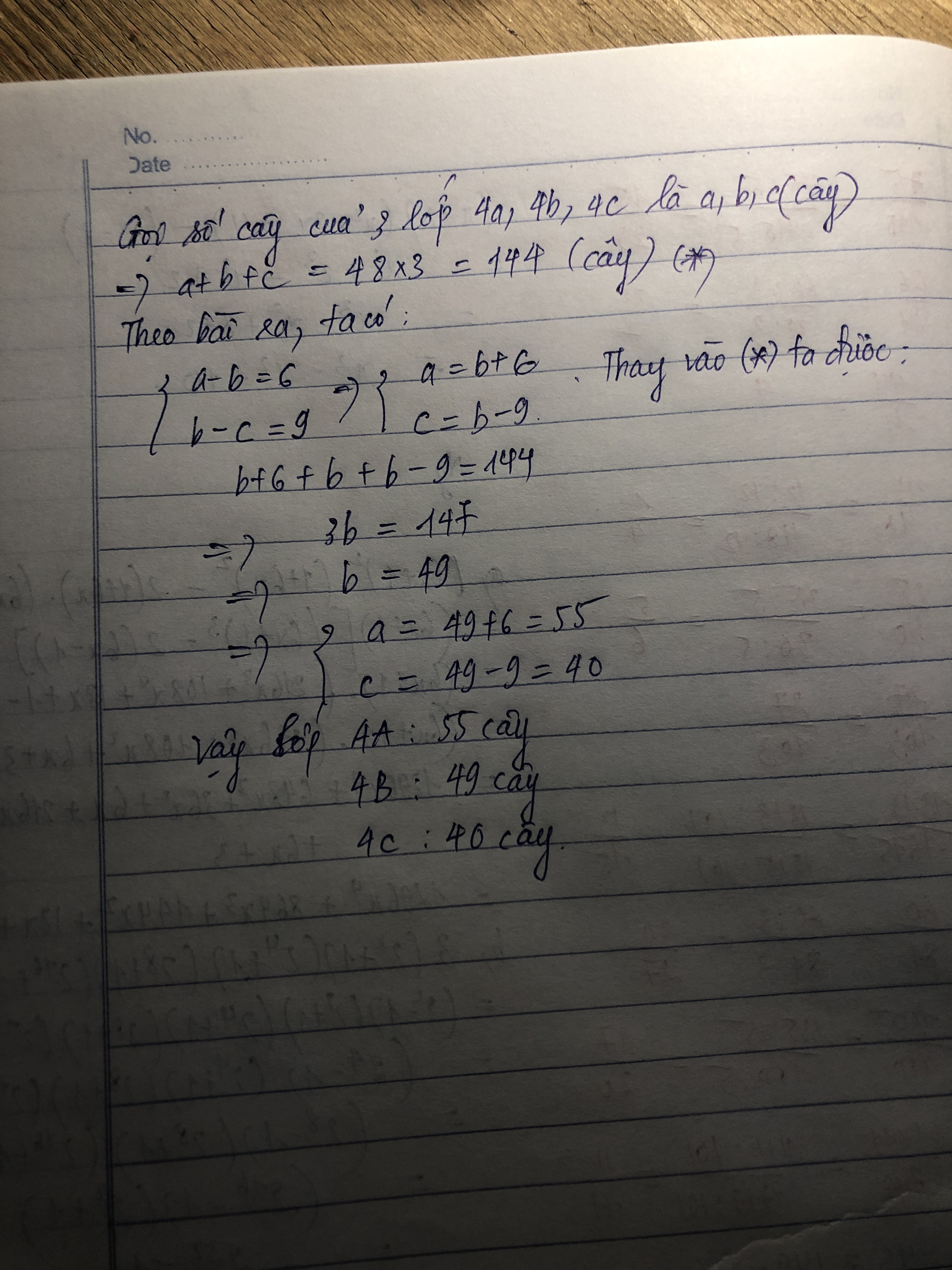 Đáp Số: Lớp 4A: 20 cây; Lớp 4B: 21 cây; Lớp 4C: 22 cây