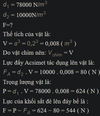 thả một khối sắt hình lập phương cạnh a=20cm vào một bể hình hộp chữ nhật đáy nằm ngang vật chìm hoàn toàn trong bể tình lực khối sắt đè lên đáy bể cho KLR của khối sắt là d1=78000 N/m^3 của nước là d2=10000 bỏ qua sự thay đổi của mực nước trong bể
