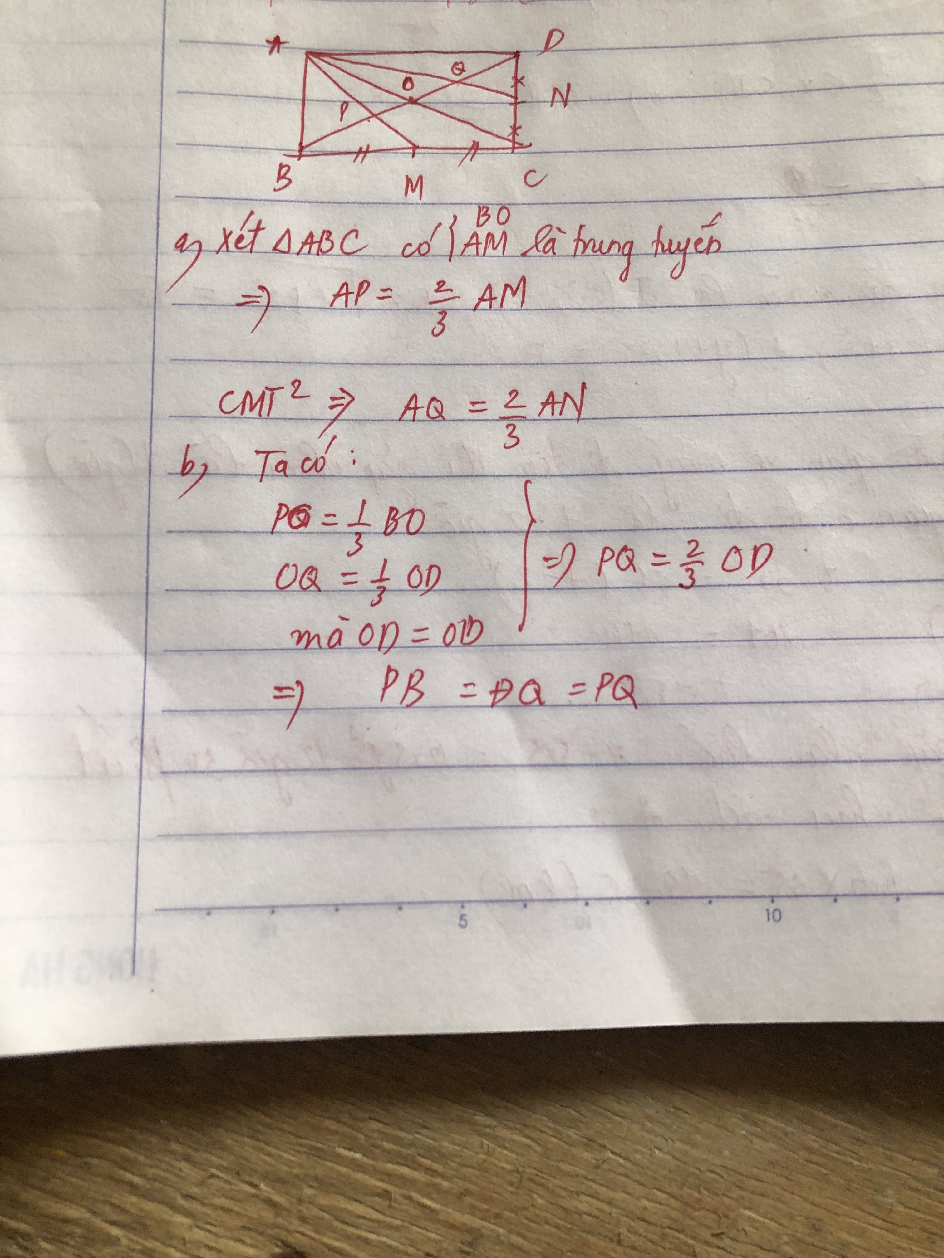 Cho hình chữ nhật ABCD (AB bé hơn AD); lấy M,N lần lượt là trung điểm BC,CD; O là giao điểm của 2 đường chéo AC,DB; Gọi P,Q là giao điểm của AM,AN với DB.