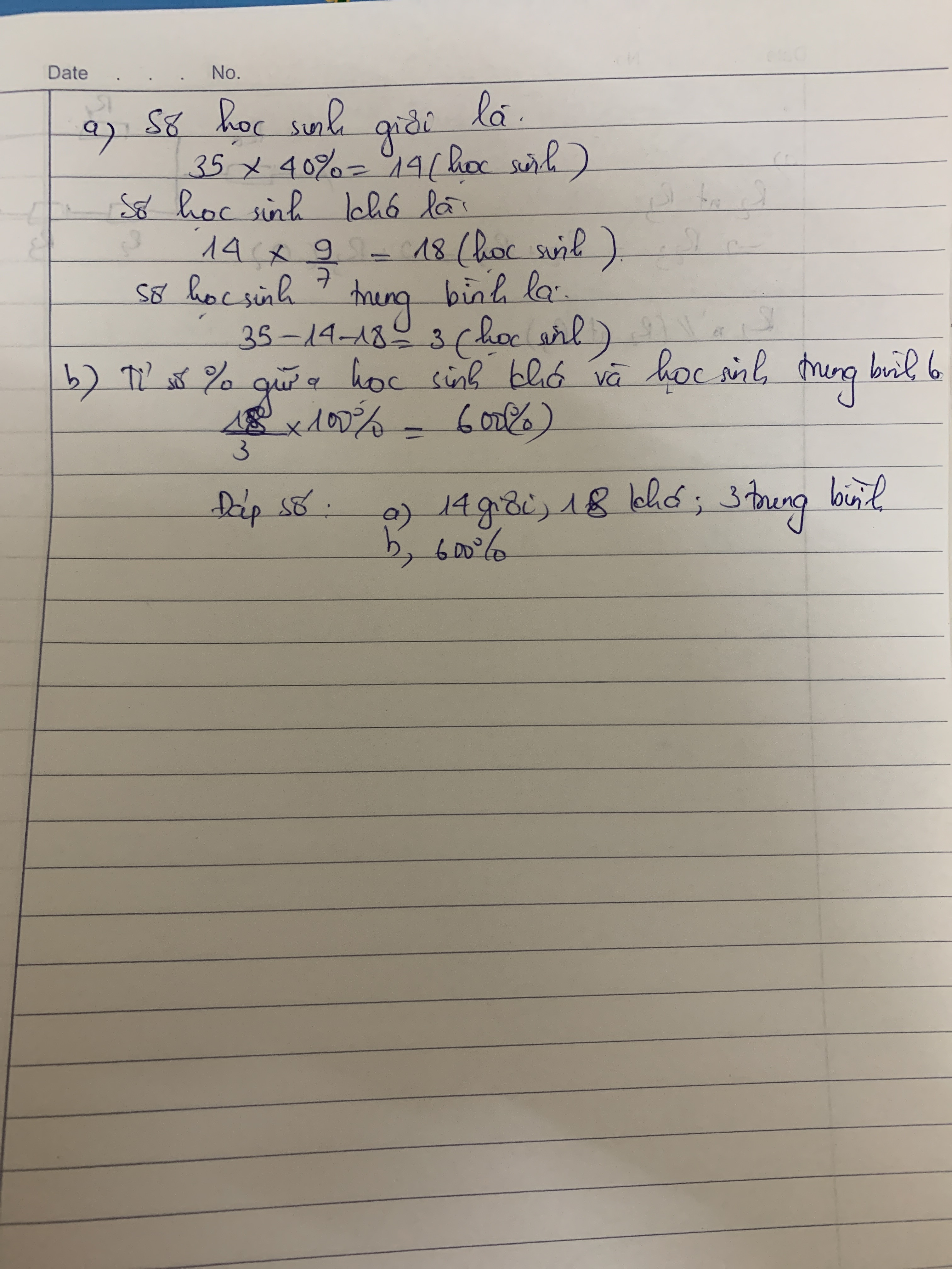 Lớp 6C có 35 HS gồm 3 loại giỏi,khá,trứng bình.Số HS giỏi bằng 40 % số HS cả lớp,số HS khá bằng 9 phần 7 số HS giỏi A)Tính mỗi loại B)Tính tỉ số % giữa HS khá,HS trung bình