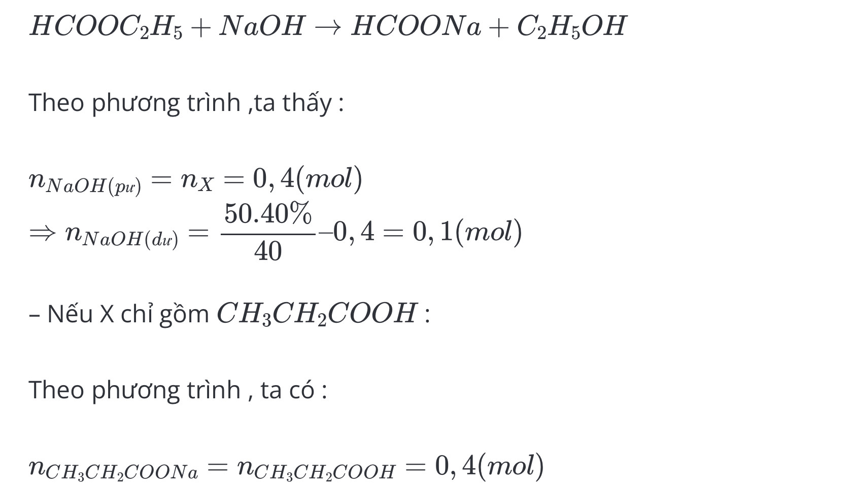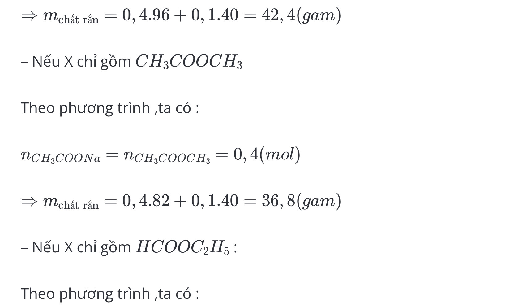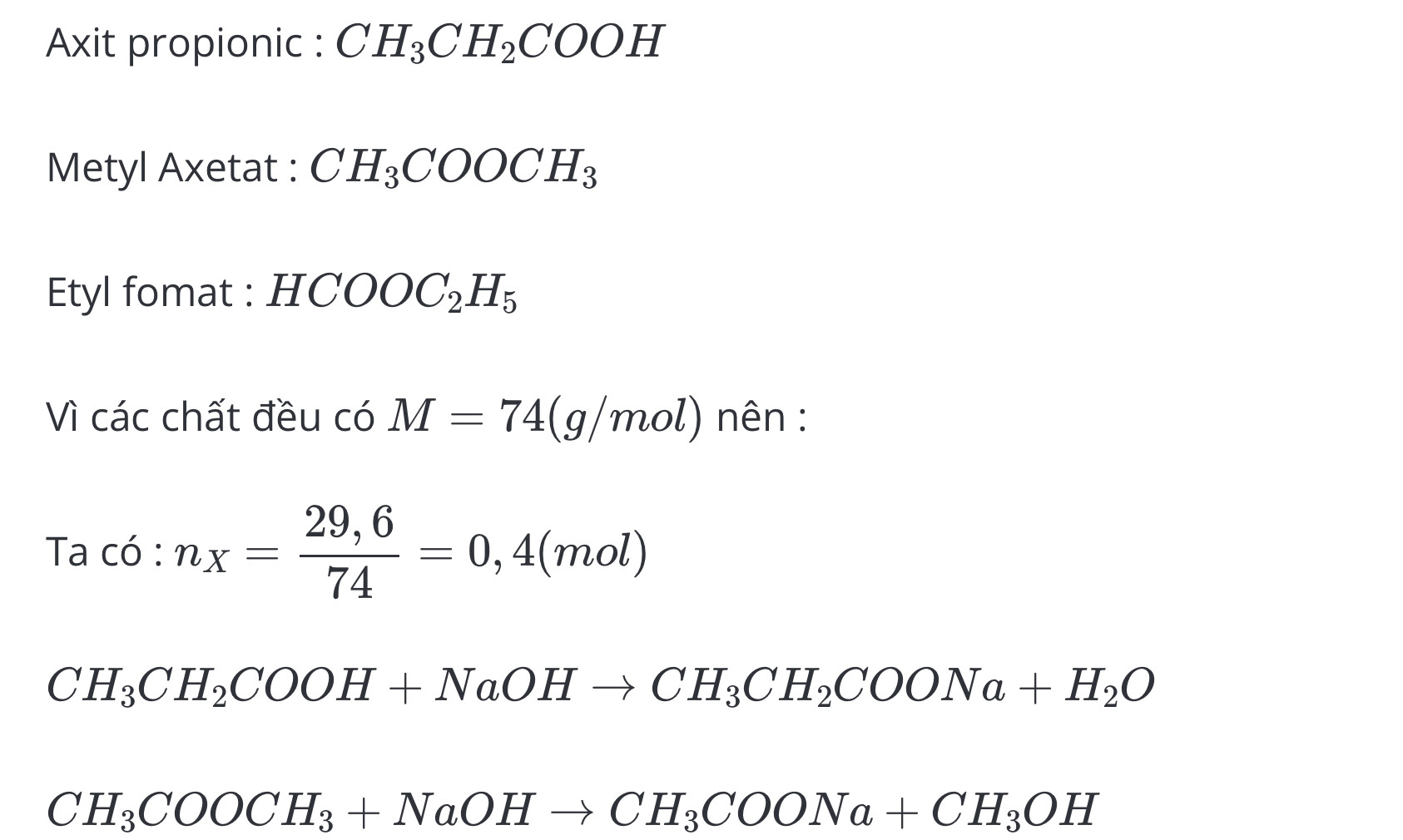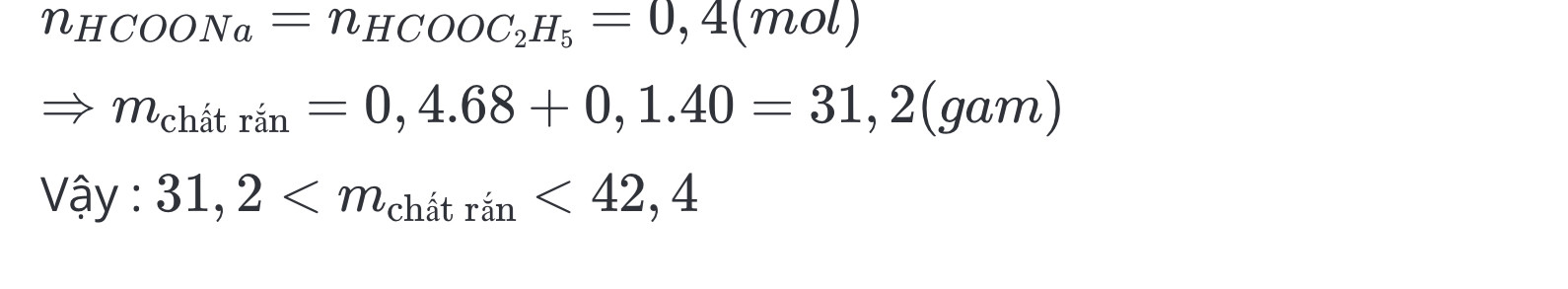 Cho29,6 gam hỗn hợp x gồm axit propionic, metyl axetat, etyl fomat tác dụng với 50gam dung dịch NaOH 40% sau phản ứng cô cạn dung dịch thu được m gam chất rắn khan. Giá trị m là