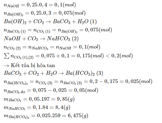 Cho 0,2 mol CO2 qua 250ml dd X gồm NaOH 0,4M và Ba(OH)2 0,3M. Tính khối lượng kết tủa thu đuoejc và khối lượng chất tan trong dd sau pư