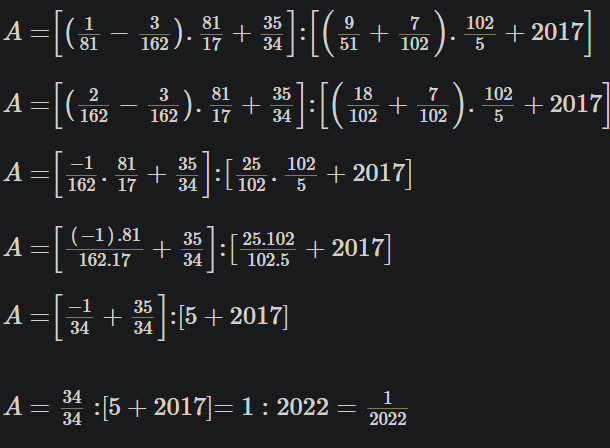 A=[(1/81-1/102)×81/17+35/34]÷[(9/51+7/102)×102/5+2017