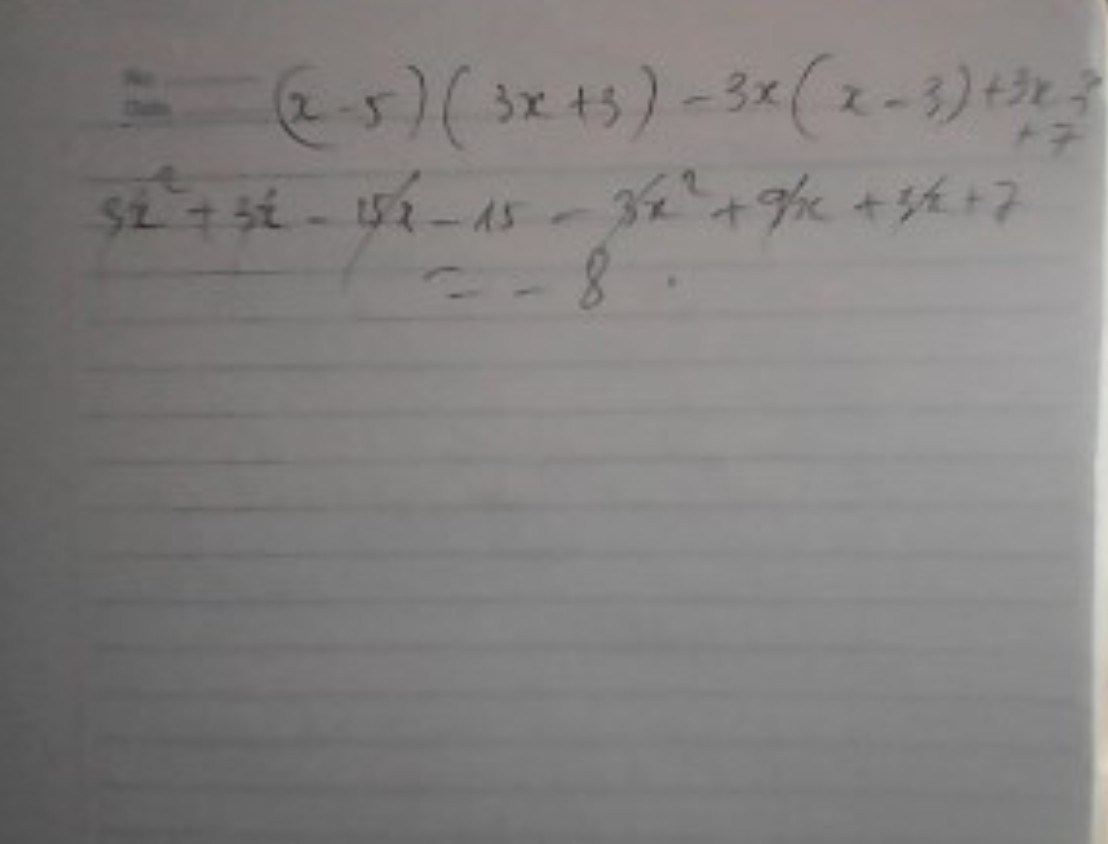 `(x-5)(3x+3) - 3x(x-3) + 3x + 7`