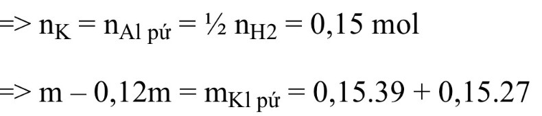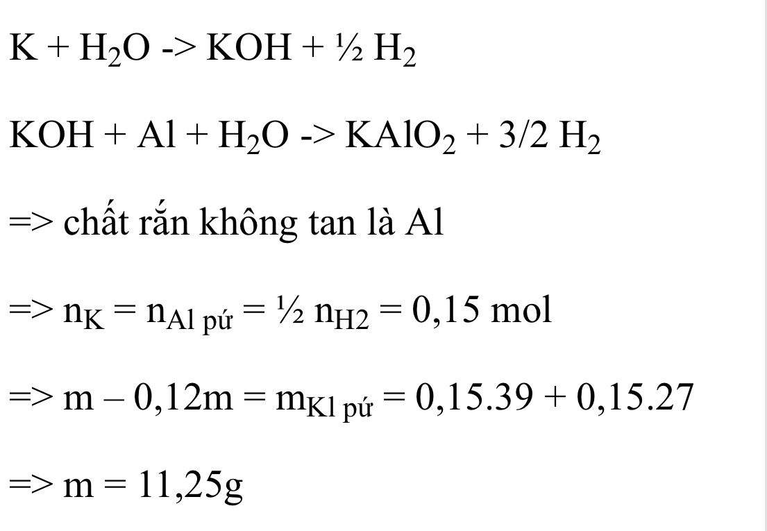 hòa tan m gam hỗn hợp X gồm Al và K vào nước dư. Sau khi các phản ứng xảy ra hoàn toàn thu được dung dịch Y; 6,72l H2 (đktc) và còn lại 0,12m gam chất rắn không tan. Tính m?